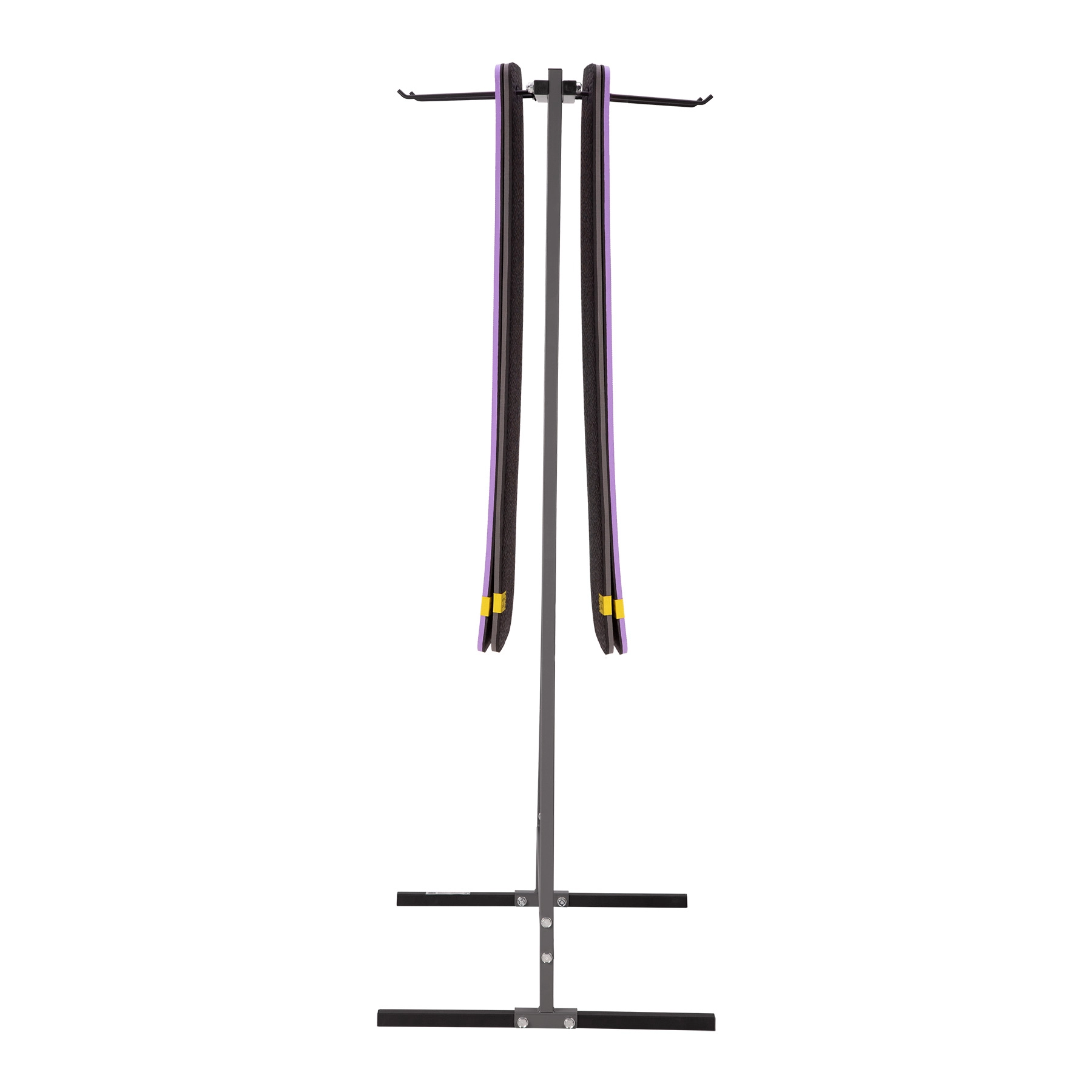 Przemyślane haczyki z regulowanym rozstawem (4–72 cm) umożliwiają zawieszenie różnych typów i szerokości mat. Minimalistyczny design w neutralnych kolorach pasuje do każdego wnętrza – od komercyjnych siłowni i studiów jogi po domowe strefy treningowe.