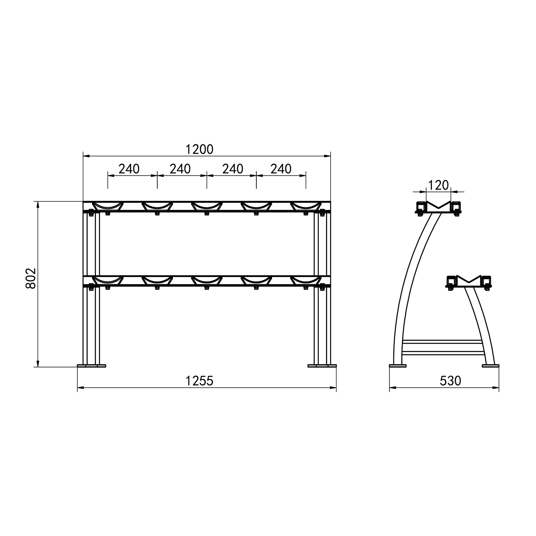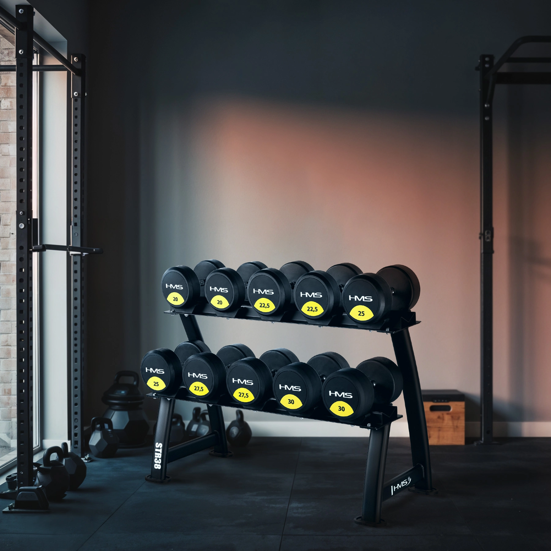 Ułóż do 10 par hantli na dwóch stabilnych półkach i utrzymuj strefę treningową przejrzystą oraz bezpieczną.