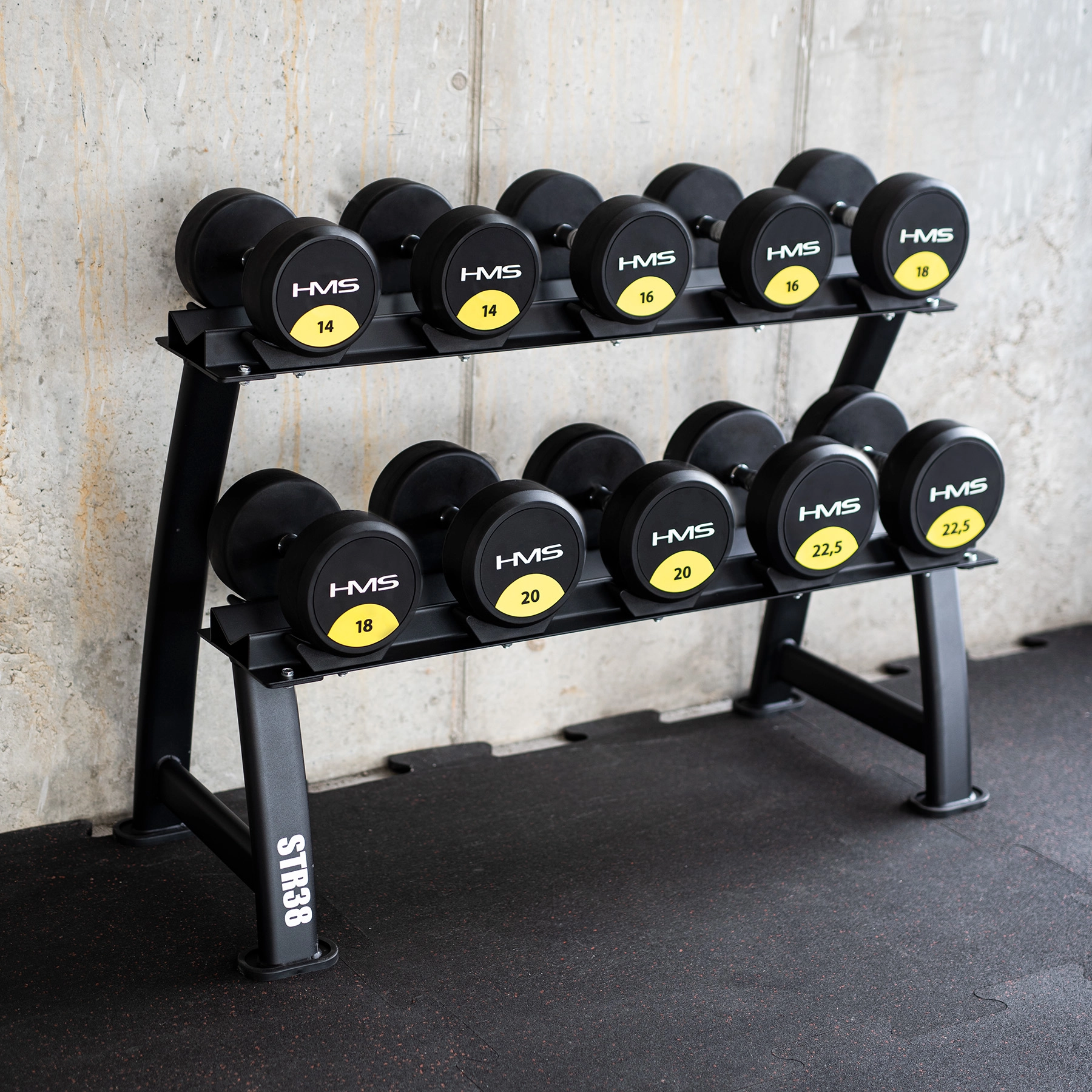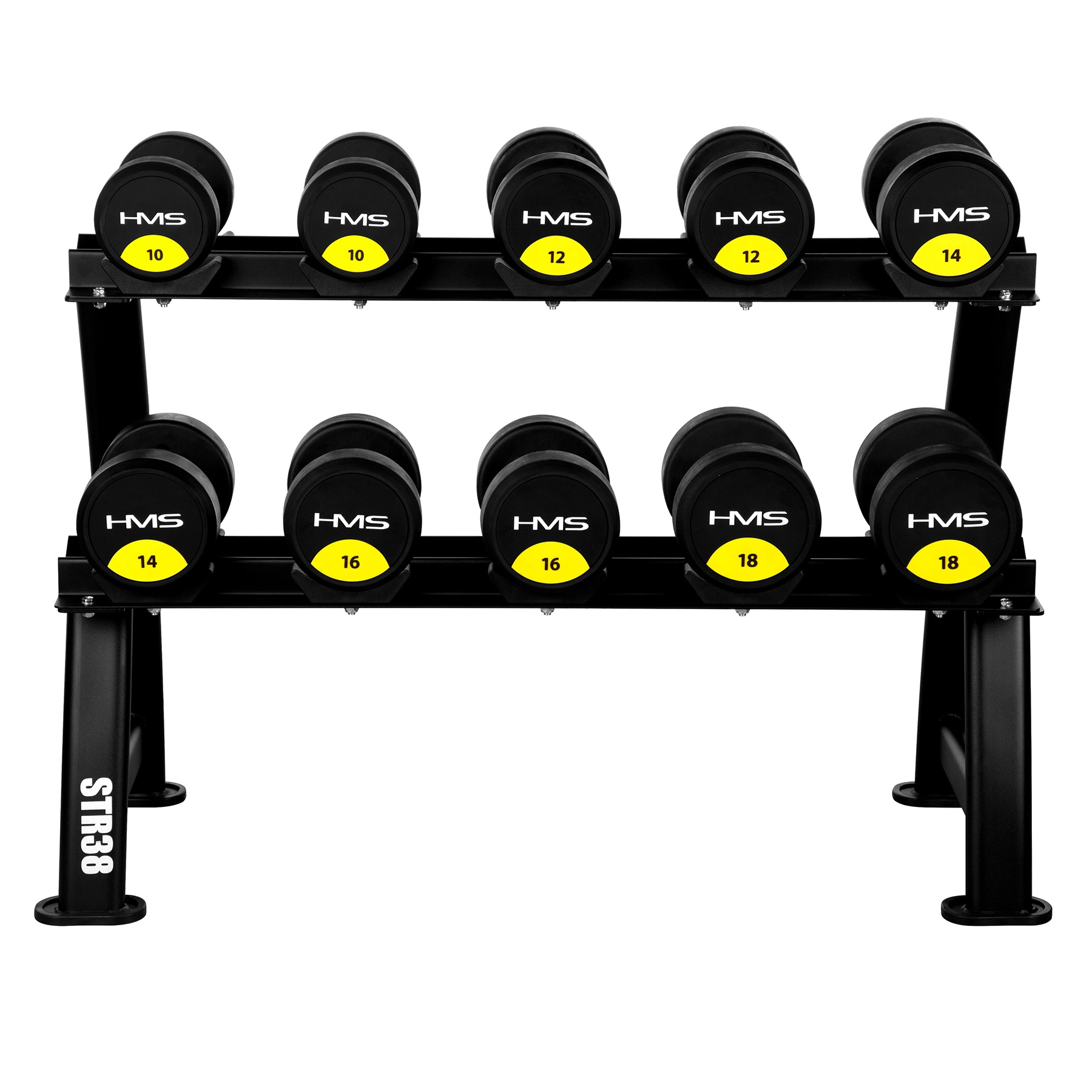 HMS STR38 to wytrzymały, dwupoziomowy stalowy stojak zaprojektowany dla szybkiego i bezpiecznego dostępu do hantli. Lekko pochylone półki ułatwiają chwyt bez nadmiernego zginania nadgarstków, a wytłoczone ograniczniki zapobiegają zsuwaniu się hantli. Stabilna podstawa z antypoślizgowymi stopkami zapewnia pewność nawet przy pełnym obciążeniu.
