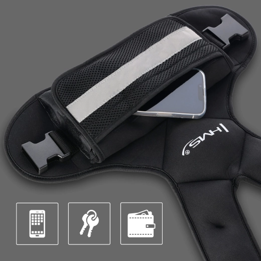 Praktyczna elastyczna kieszeń z siatki z przodu mieści telefon, klucze lub drobiazgi, a neoprenowy, odporny na pot materiał i regulowane paski zapewniają pewne i wygodne dopasowanie do ciała. Elementy odblaskowe zwiększają bezpieczeństwo podczas treningu na zewnątrz przy słabszej widoczności.