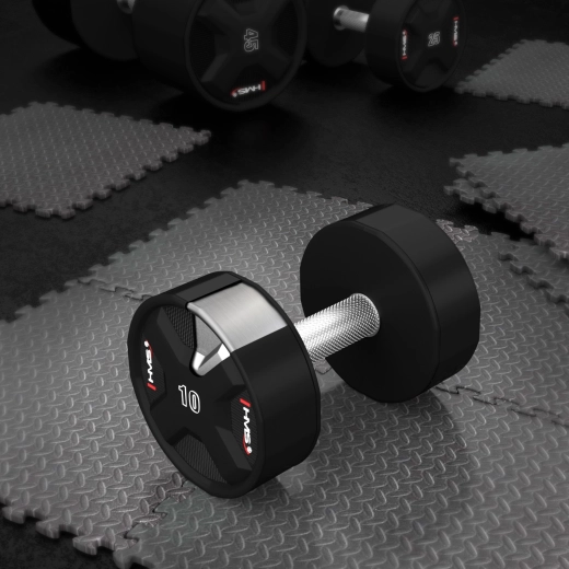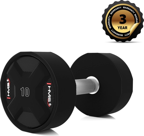 Poliuretanowa hantla HMS 10 kg została zaprojektowana do intensywnego treningu siłowego. Łączy stalowy rdzeń z odlewanym płaszczem z poliuretanu, który jest odporny na upadki, wstrząsy i zużycie, nie wydziela nieprzyjemnego zapachu i jest łatwy w utrzymaniu. Precyzyjnie radełkowana chromowana rękojeść gwarantuje pewny chwyt nawet przy wymagających seriach.
