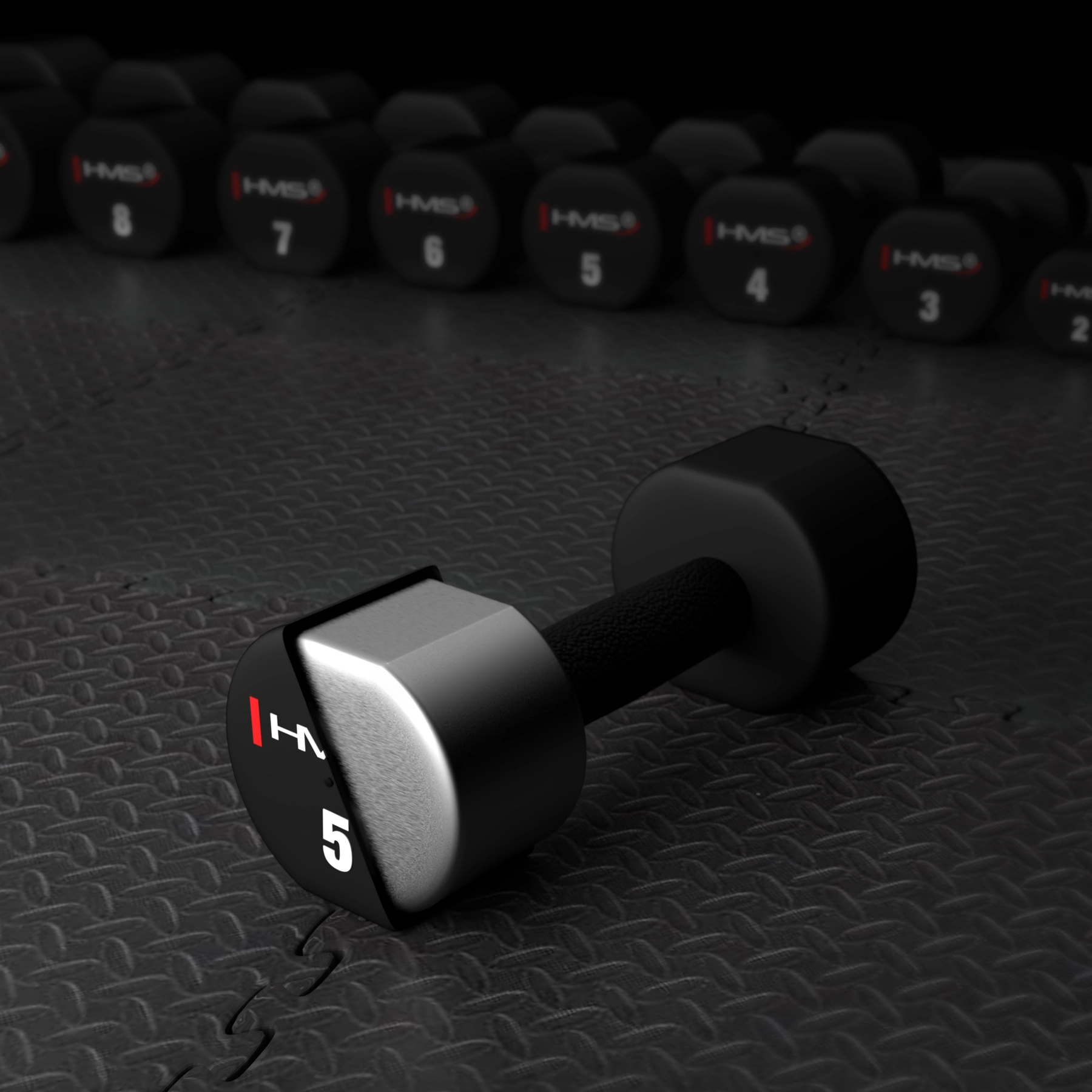 Zestaw dwóch hantli HMS HPT 2 × 5 kg łączy stalowy rdzeń z czarną warstwą termoplastycznego poliuretanu (TPU) dla maksymalnej trwałości i komfortu. Powierzchnia jest bezzapachowa, chroni podłogę i tłumi hałas, dzięki czemu sprawdzi się w siłowni domowej i komercyjnej. Radełkowany (ryflowany) chwyt zapewnia pewność w dłoni nawet przy intensywnych seriach.