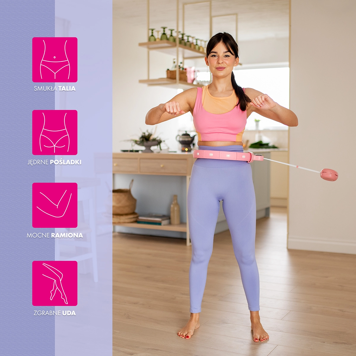 W przeciwieństwie do klasycznego hula-hoopu obręcz nie spada, pozostaje stabilnie na miejscu, a ciężarek na sznurku wytwarza opór odśrodkowy dla intensywniejszych ćwiczeń. Regularne używanie pomaga wyszczuplić talię, modelować brzuch, uda i pośladki oraz poprawić kondycję. Powierzchnia z wysokiej jakości PVC i ABS zapewnia trwałość i długą żywotność.