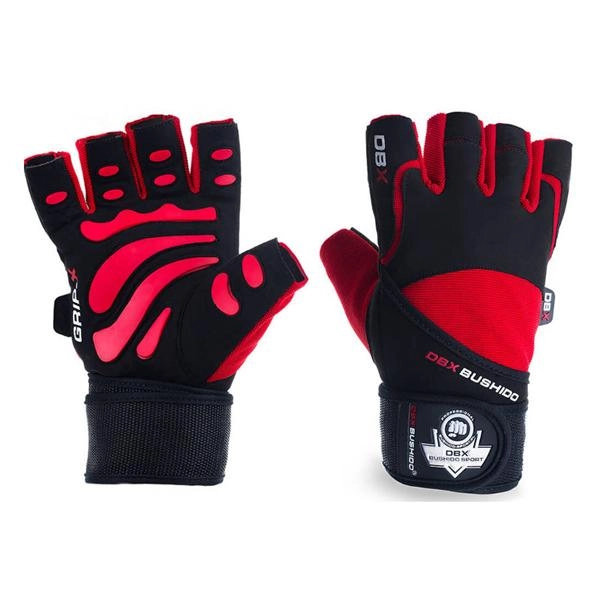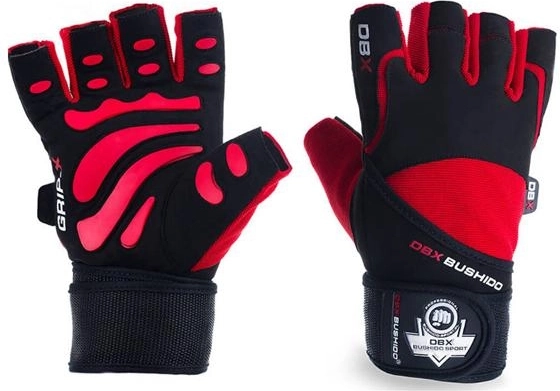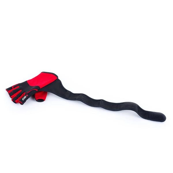Szeroki elastyczny pas z podwójnym owinięciem wokół nadgarstków i podwójnym rzepem zapewnia ponadstandardową stabilność i wsparcie przy wyciskaniu, podciąganiu i pracy na drążku. Rękawice w czarno‑czerwonej kolorystyce wykonano z połączenia skóry syntetycznej, poliestru i gumy, dzięki czemu dobrze leżą, nie ślizgają się i wytrzymują długotrwałe użytkowanie.