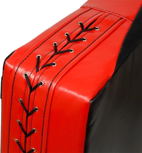 Praktyczne otwory wentylacyjne rozpraszają ciśnienie powietrza podczas trafień, co zmniejsza ryzyko uszkodzeń. Zamiast zamka zastosowano wytrzymałe sznurowanie dla pewności i stabilności kształtu. Ergonomiczne wyprofilowanie tarczy pomaga prowadzić techniki precyzyjnie do środka i zapobiega ześlizgiwaniu się kończyny poza cel, zwiększając bezpieczeństwo trenera.