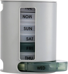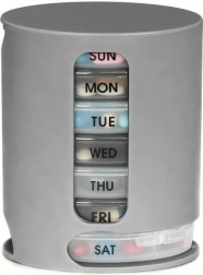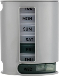 Tygodniowy organizer na leki ułatwia planowanie i regularne przyjmowanie medykacji. Siedem osobnych pojemników umieszczono w stojaku; każdy box jest oznaczony dniem tygodnia (EN) i podzielony na 4 przegródki – rano, południe, wieczór, noc. Wystarczy wysunąć pojemnik od dołu, przyjąć dawkę i odłożyć go na górę – system jest szybki, przejrzysty i higieniczny.