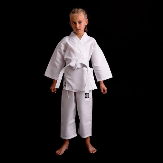 Praktyczny krój i podwójne zapięcie spodni (guma + sznurek) zapobiegają zsuwaniu, pozwalając dzieciom skupić się wyłącznie na technice. W skład zestawu wchodzi również biały pas o długości 210 cm, więc nic nie stoi na przeszkodzie, by natychmiast rozpocząć trening.