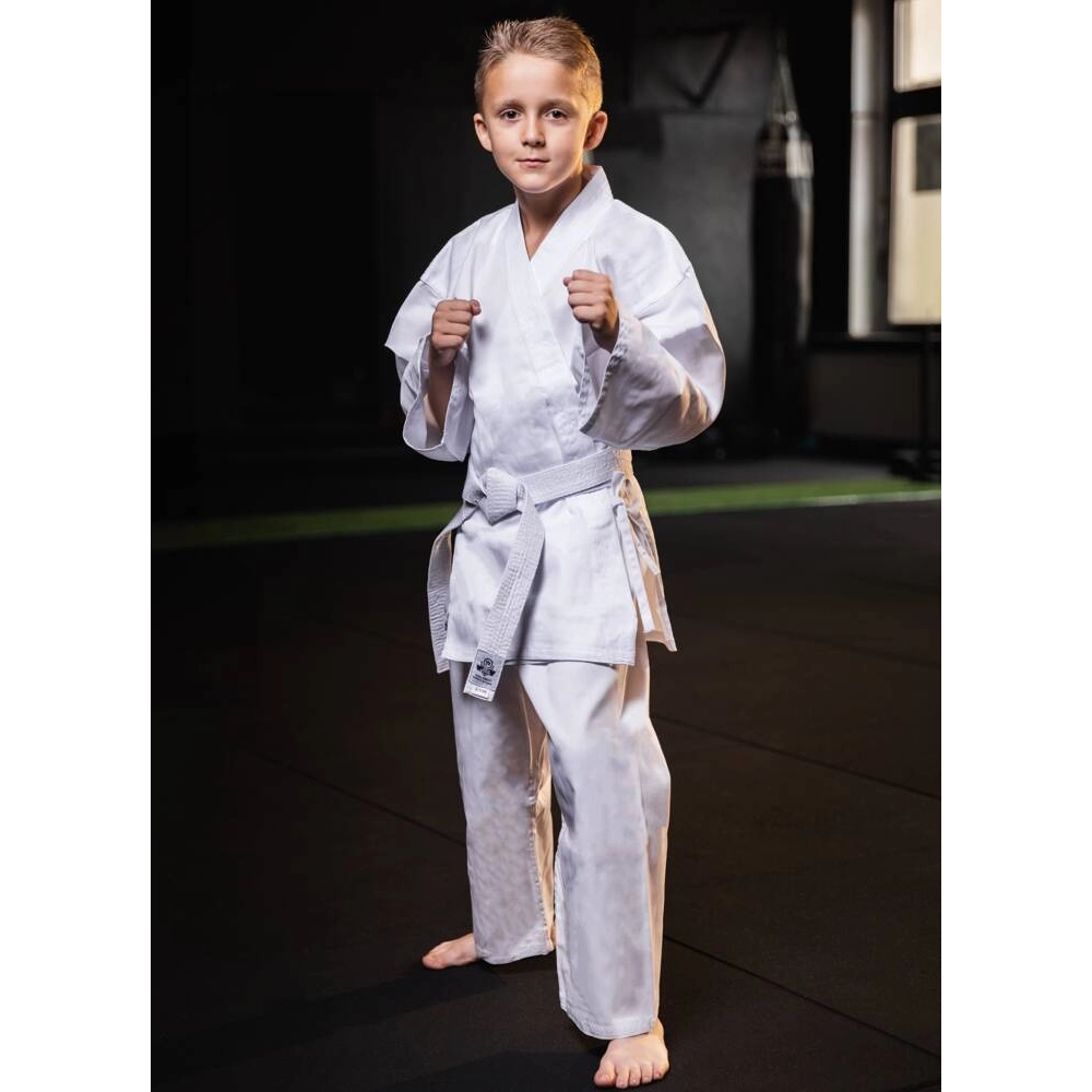 Praktyczny krój ze wzmocnieniami w kroku i na brzegach kurtki zwiększa trwałość przy regularnych treningach. Spodnie mają podwójne zapięcie – gumkę i sznurek, więc nie zsuwają się i pozostają na miejscu nawet podczas dynamicznych kombinacji. W skład zestawu wchodzi biały pas, który pozwala dzieciom od razu ruszyć na trening.