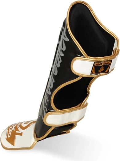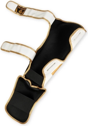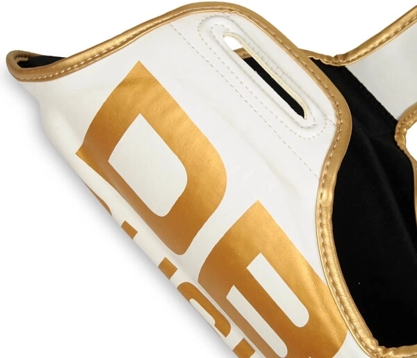 Bezpieczne mocowanie zapewniają szerokie i mocne paski z łatwym systemem zapinania. Powierzchnię w eleganckiej biało‑złotej kolorystyce uzupełnia wysokiej jakości szycie dla długiej żywotności. Odpowiednie do kickboxingu, muay thai, MMA i innych sportów kontaktowych – do treningu technik i sparingów.