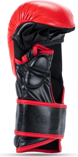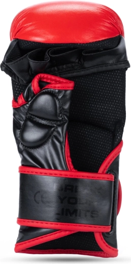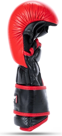 Część uderzeniowa została wykonana z wysokiej jakości naturalnej skóry bydlęcej dla wysokiej wytrzymałości, a mankiet z innowacyjnej wzmocnionej skóry syntetycznej dla pewnej stabilizacji. Przemyślane wyprofilowanie w miejscu zapięcia na rzep zapobiega przypadkowemu zahaczaniu i odpinaniu podczas grapplingu. Wnętrze rękawic stanowi gładka podszewka zapewniająca komfort bez otarć.