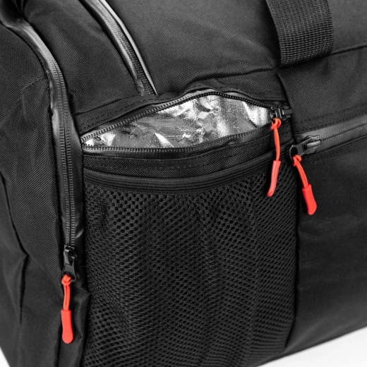 Przemyślany system kieszeni utrzymuje porządek i zapewnia szybki dostęp do rzeczy. Oprócz pojemnej komory głównej do dyspozycji jest oddzielna komora na buty, izolowana kieszeń termiczna na jedzenie i napoje, kilka kieszeni na zamek, dwie otwarte przegrody oraz kieszeń na powerbank lub odtwarzacz z przepustem na kabel. Wodoodporne materiały i zamki chronią zawartość nawet w deszczu, a odblaskowe lamowanie poprawia widoczność po zmroku.