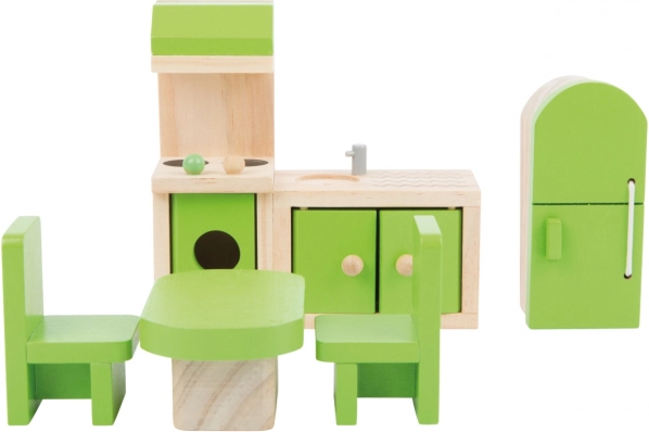 Ten szczegółowo wykonany zestaw kuchenny do domków oferuje wszystko, czego mali kucharze potrzebują – zlew, kuchenkę, lodówkę, stół i dwa krzesełka w przyjemnym połączeniu naturalnego drewna i świeżych zielonych akcentów. Dzięki litemu drewnu meble są stabilne i gotowe na codzienną zabawę.