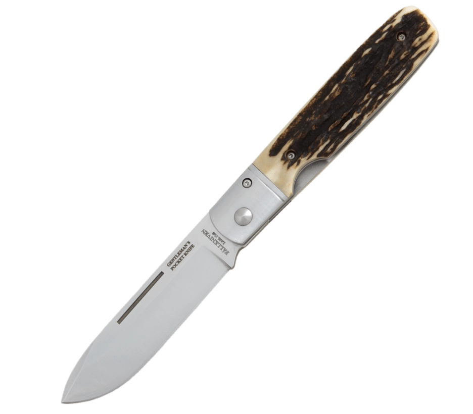 Rękojeść z prawdziwego poroża jelenia nadaje każdemu egzemplarzowi oryginalny charakter oraz ciepły, pewny chwyt. Bezpieczne użytkowanie gwarantuje blokada Linerlock oraz tradycyjne, manualne otwieranie wycięciem na głowni. Nóż uzupełnia eleganckie zamszowe etui do bezpiecznego noszenia.