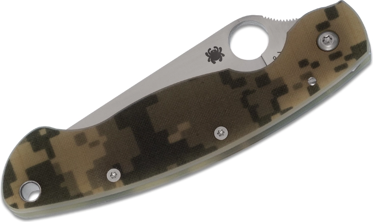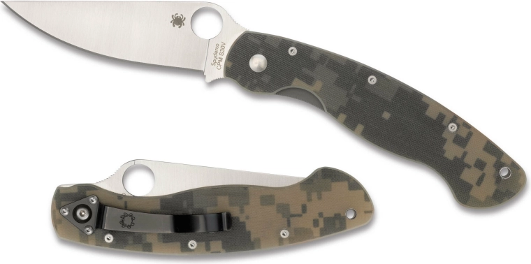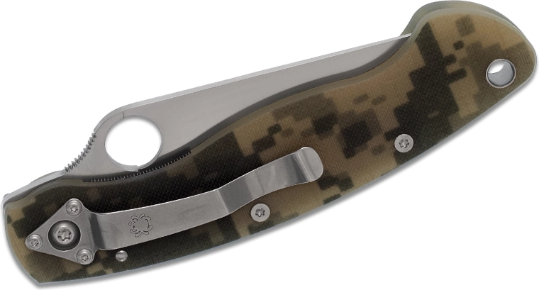 Taktyczny nóż składany SPYDERCO Military Digital Camo został zaprojektowany do wymagających zastosowań oraz codziennego EDC. Oferuje ostrze ze stali CPM-S30V z satynowym wykończeniem, niezawodną blokadę Liner Lock oraz lekką, a jednocześnie wytrzymałą rękojeść G10 z cyfrowym kamuflażem i klipsem do noszenia.
