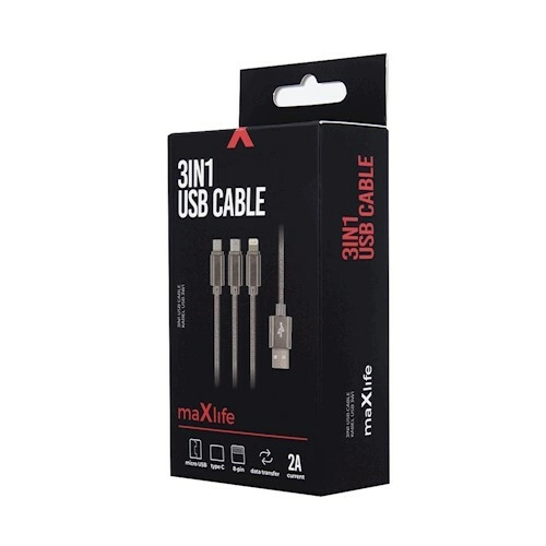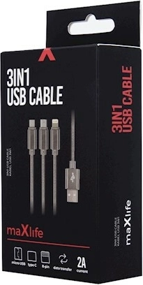 Maxlife nylonowy kabel 3w1 z szybkim ładowaniem 2.1 A – Lightning/USB‑C/microUSB, szary