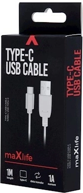 Uniwersalny kabel Maxlife z konektorem USB‑C do codziennego użytku. Oferuje niezawodne ładowanie prądem do 1 A oraz transfer danych między smartfonem a komputerem. Dzięki długości 1 m jest idealny do domu i biura, a jego elastyczna, wytrzymała konstrukcja zapewnia długą żywotność i wygodne użytkowanie.