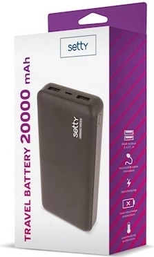 Kompaktowa i niezawodna powerbank SETTY 20 000 mAh w eleganckim czarnym kolorze zapewni wystarczająco dużo energii w podróży. Ładuj smartfony, tablety i inne urządzenia zawsze i wszędzie dzięki dwóm wyjściom USB oraz praktycznemu wejściu micro USB. Stabilne wyjście 5 V z prądem do 2,4 A gwarantuje szybkie i bezpieczne ładowanie.