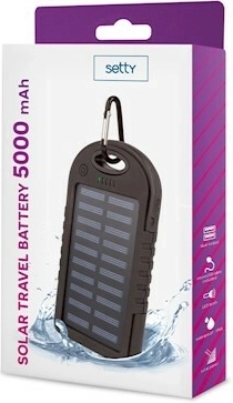 Kompaktowy i wytrzymały solarny powerbank Setty o pojemności 5000 mAh niezawodnie naładuje Twój telefon, tablet lub GPS także z dala od cywilizacji. Ładuj go za pomocą panelu solarnego lub przez USB, korzystaj z dwóch wyjść USB, wodoodporności IP66 oraz zintegrowanego światła LED – idealny towarzysz w podróży i na łonie natury.