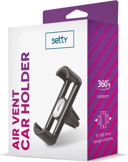Uniwersalny uchwyt samochodowy SETTY do montażu na kratce wentylacyjnej zapewnia pewne i wygodne korzystanie z telefonu podczas jazdy. Dzięki obrotowej głowicy o 360° łatwo ustawisz idealny kąt widzenia. Nadaje się do smartfonów o szerokości 5,1–8,5 cm i utrzymuje je w zasięgu ręki. Kompaktowa konstrukcja w czarnym kolorze pasuje do większości wnętrz samochodów.