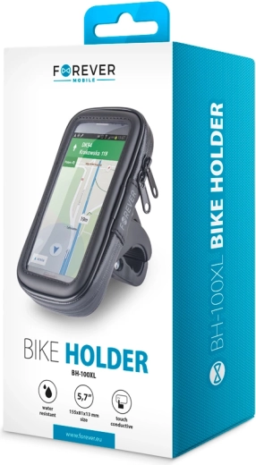 Uniwersalny uchwyt i etui na kierownicę dla smartfonów do 5,7" – FOREVER BH-100 XL. Chroni telefon przed deszczem dzięki przezroczystej folii, przez którą urządzenie jest w pełni obsługiwalne. Łatwy montaż na rowerze lub motocyklu za pomocą klipsa oraz szybki dostęp przez zamek błyskawiczny.