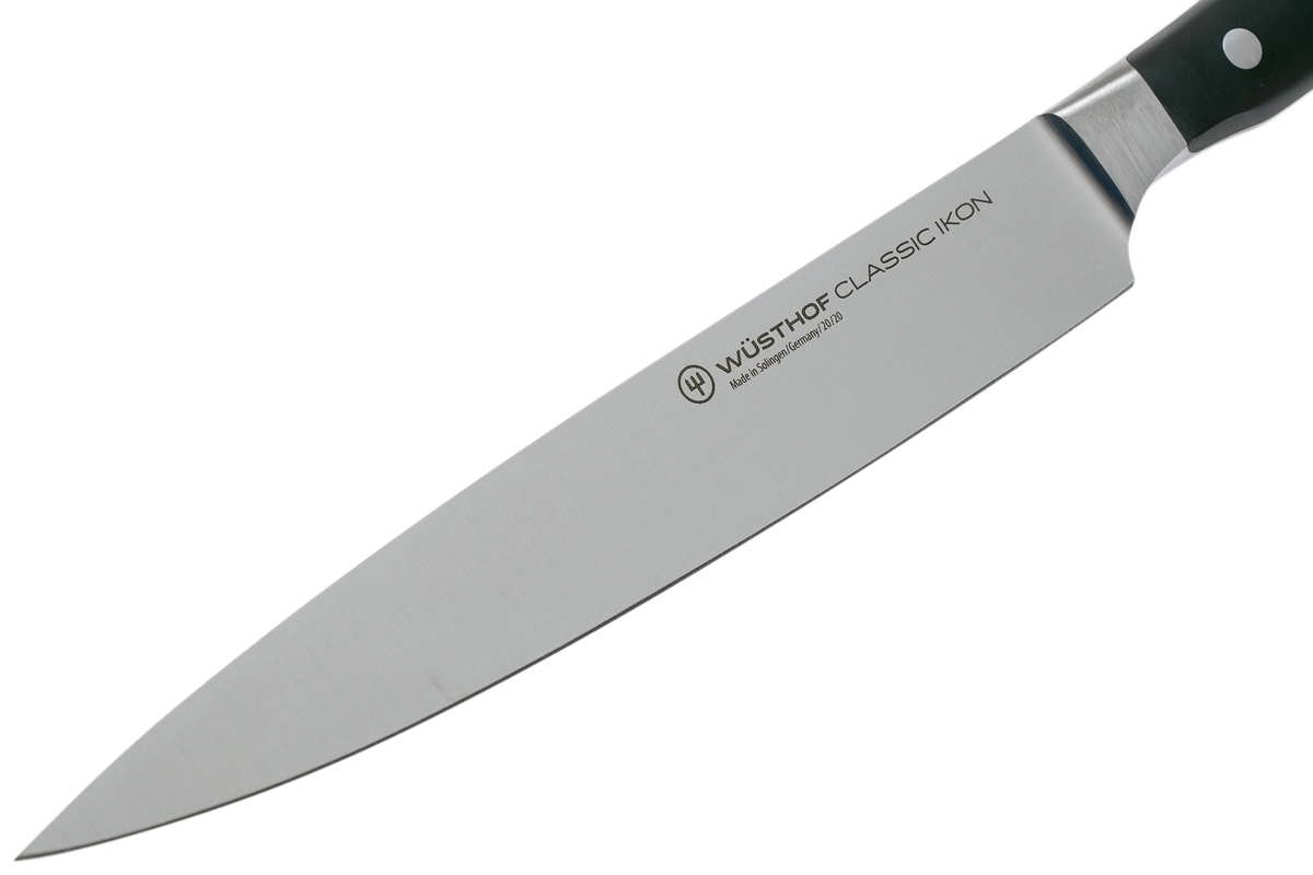 Nóż do szynki WÜSTHOF Classic Ikon (20 cm) to uniwersalne narzędzie do precyzyjnego krojenia szynki, mięsa, a także większych kawałków owoców i warzyw. Klinga z wysokiej jakości stali nierdzewnej X50CrMoV15 długo utrzymuje ostrość, a dzięki przemyślanej geometrii gładko przechodzi przez produkty bez ich szarpania.
