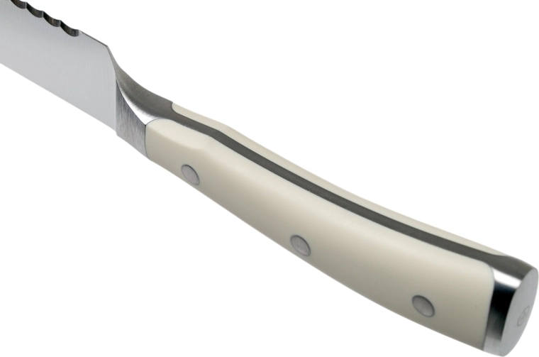Kremowa rękojeść z POM z trzema nitami i konstrukcją full-tang zapewnia bezpieczny chwyt i stabilność podczas krojenia.
