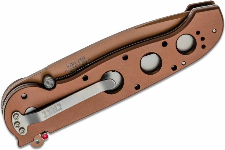 Rękojeść z anodowanego aluminium 6061-T6 w miedzianym odcieniu zapewnia niską masę, pewny chwyt oraz otwory odciążające dla lepszego wyważenia.