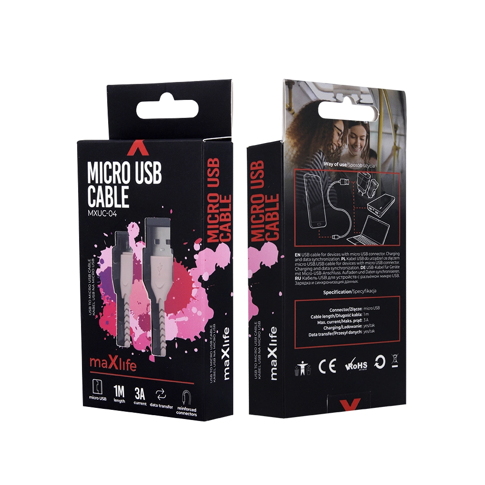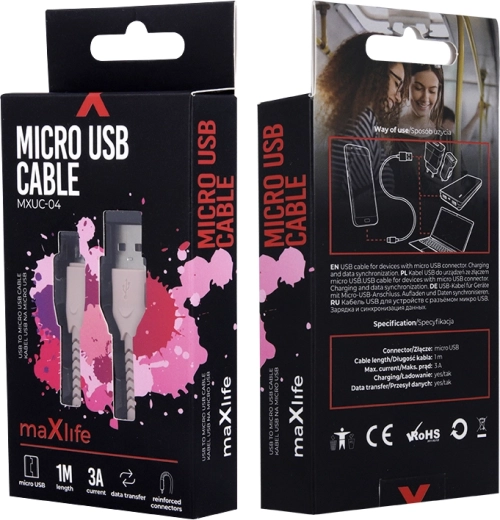 Wytrzymały i stylowy kabel microUSB Maxlife o długości 1 m do szybkiego ładowania i niezawodnego transferu danych. Dzięki nylonowemu oplotowi i wzmocnionym złączom wytrzymuje codzienne użytkowanie, obsługuje prąd do 3 A i jest idealny do telefonów oraz innych urządzeń z microUSB.
