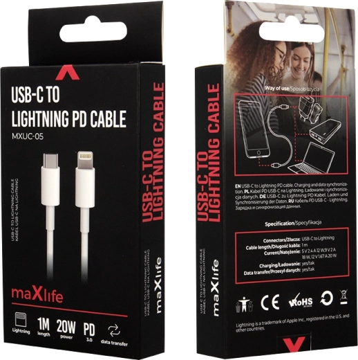 Szukasz niezawodnego kabla do urządzeń złączem Lightning? Maxlife USB‑C – Lightning w eleganckim białym kolorze zapewnia szybkie ładowanie Power Delivery 20 W oraz stabilną synchronizację danych. Dzięki długości 1 metr wygodnie sięga od ładowarki do telefonu, zarówno przy biurku, jak i w podróży.