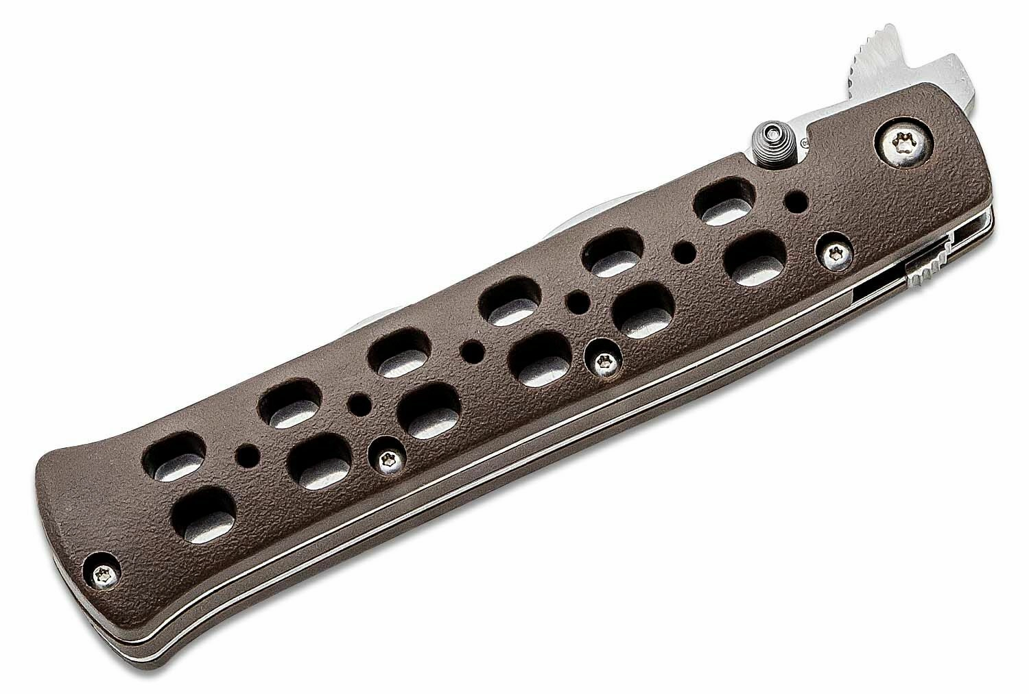 Ostrze z japońskiej stali nierdzewnej AUS-10A z satynowym szlifem zapewnia świetny kompromis między ostrością, ciągliwością i odpornością na korozję. Konstrukcja oferuje mocną sprężynową blokadę Cold Steel o deklarowanej wytrzymałości ok. 66 kg, dzięki czemu możesz polegać na bezpieczeństwie przy wymagających zadaniach. Ergonomiczna brązowa rękojeść z Zy-Ex jest lekka, solidna i przyjemnie teksturowana dla pewnego chwytu.