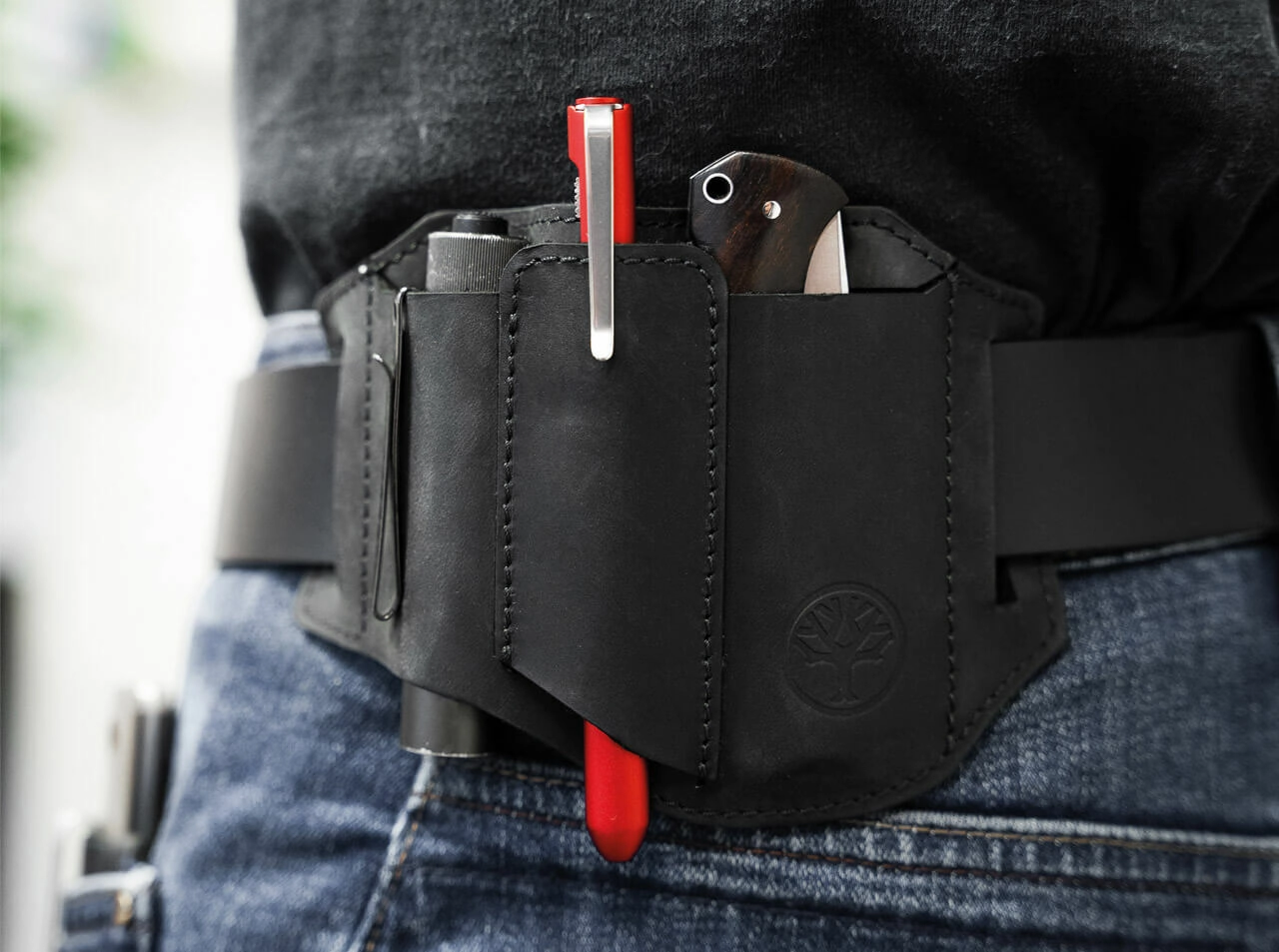 Praktyczne i eleganckie skórzane etui Böker ED-Three w czarnym kolorze jest idealne do codziennego noszenia. Oferuje trzy oddzielne przegródki na nóż, latarkę i długopis, wykonane jest z wysokiej jakości skóry nubukowej, a zdobi je wytłaczane logo BÖKER. Pasuje do pasków o szerokości do 4,4 cm i można je nosić po prawej i lewej stronie.