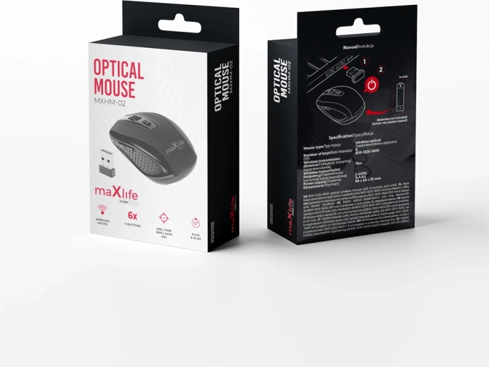Praktyczna i stylowa czarna mysz Maxlife Home Office jest idealna do biura i do domu. Dzięki bezprzewodowemu połączeniu o zasięgu do 10 m i technologii plug-and-play wystarczy ją podłączyć, aby od razu pracować. Regulowana rozdzielczość 800/1200/1600 DPI pozwala dopasować czułość dla precyzyjnego sterowania kursorem.