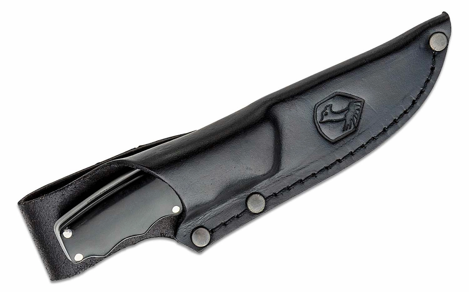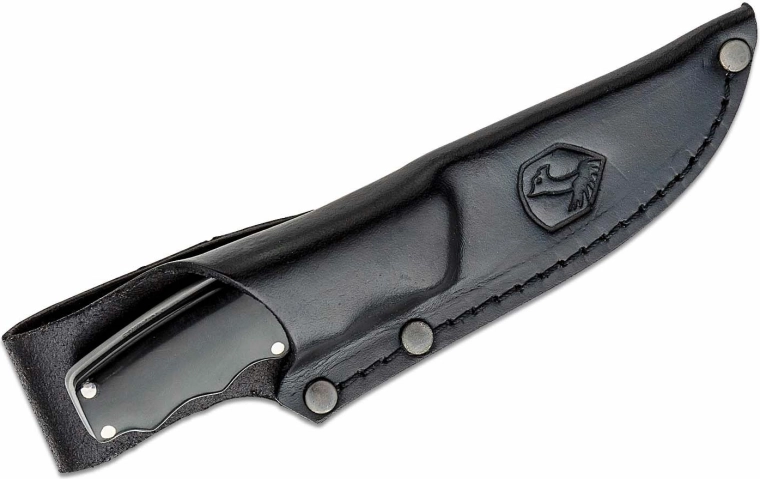 Rękojeść z trwałego kompozytu G10 w czarnym kolorze oferuje pewny i wygodny chwyt także w rękawicach lub na mokro. W zestawie znajduje się wysokiej jakości skórzane etui do bezpiecznego i stylowego noszenia na pasku.