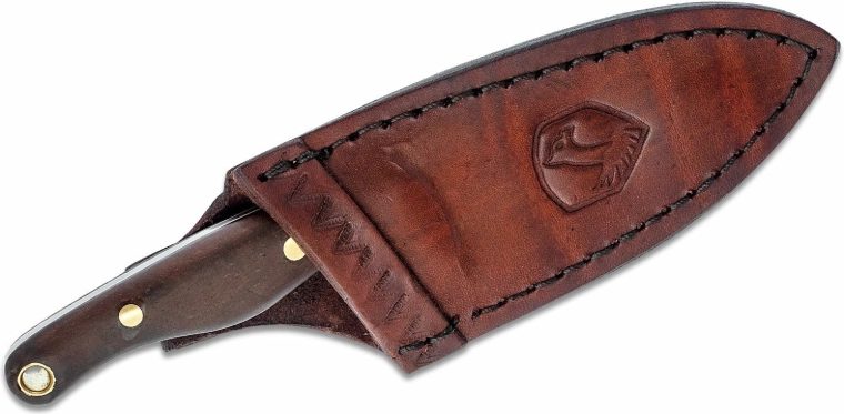 Zaokrąglona końcówka zwiększa bezpieczeństwo podczas pracy, co docenią początkujący i młodsi użytkownicy pod nadzorem. Profilowana rękojeść z drewna orzechowego świetnie leży w dłoni, nitowane okładziny zapewniają stabilność, a otwór na linkę umożliwia zamocowanie pętli zabezpieczającej lub zawieszenie. Naturalne wykończenie powierzchni nadaje ostrzu odporność i autentyczny wygląd, a skórzane etui pozwala na bezpieczne noszenie przy pasku.