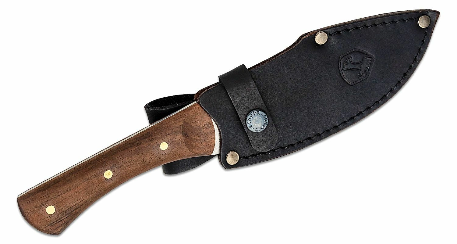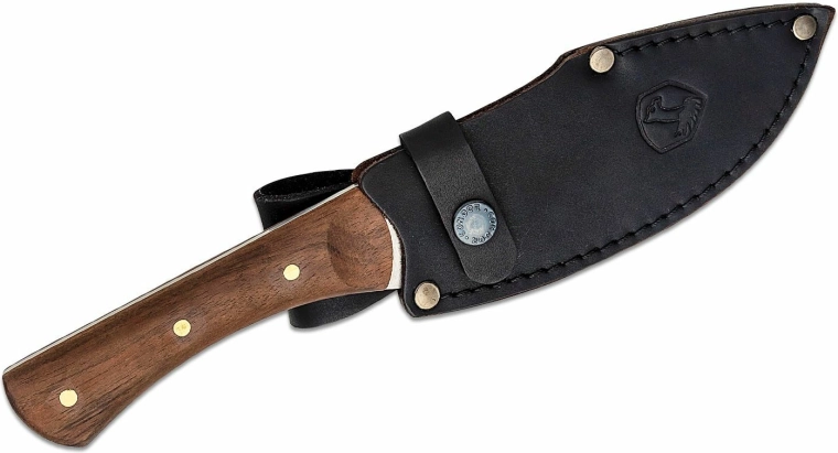 Stal 440HC zapewnia zrównowaczone połączenie odporności na korozję, trzymania ostrości oraz łatwości ostrzenia. Ergonomicznie ukształtowana rękojeść z drewna orzechowego gwarantuje pewny i wygodny chwyt nawet podczas dłuższej pracy. Ciemne skórzane etui umożliwia bezpieczne przechowywanie i noszenie na pasie.
