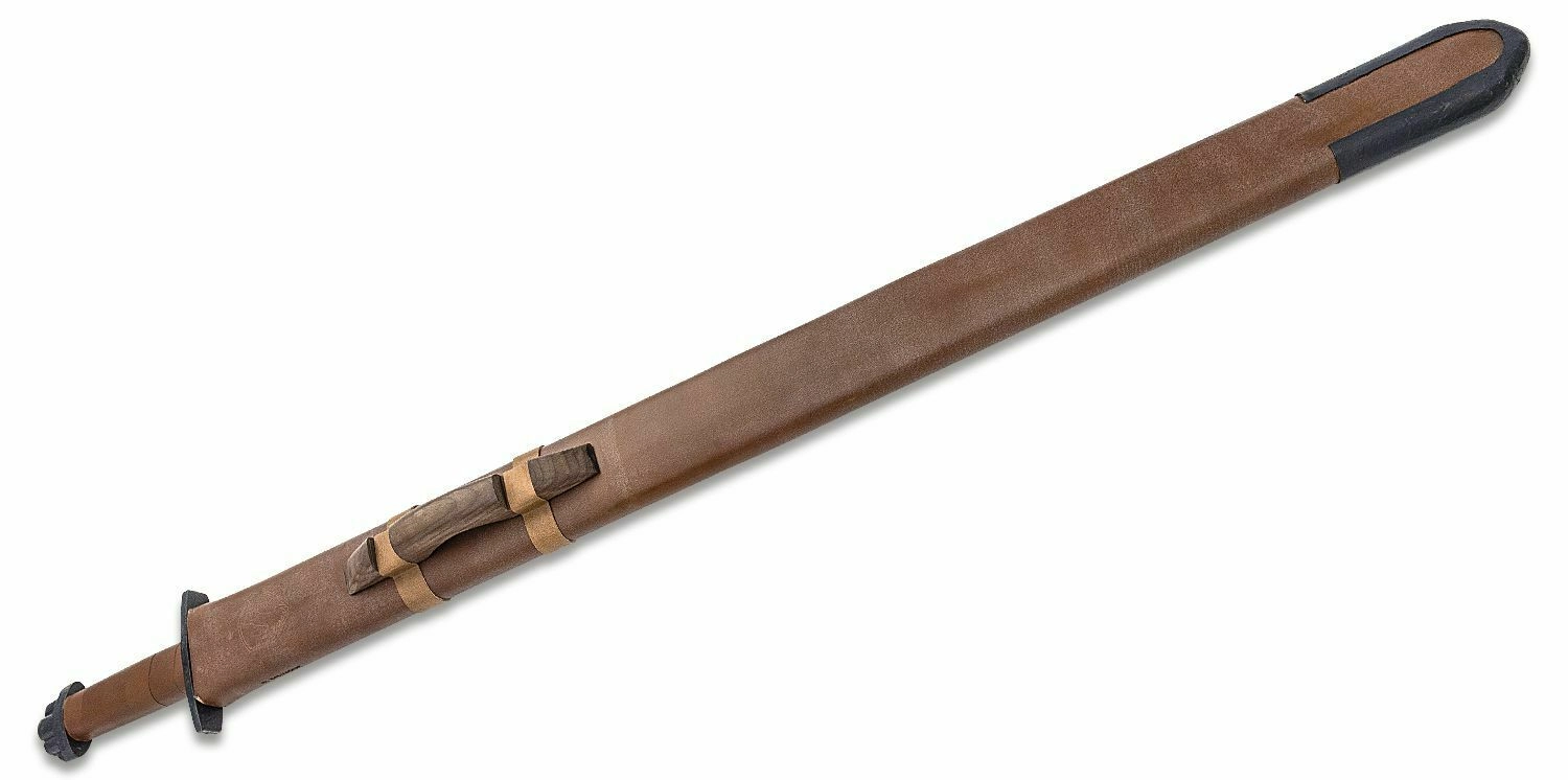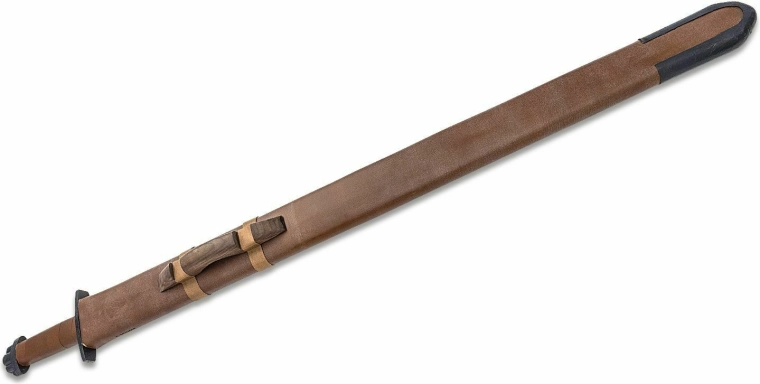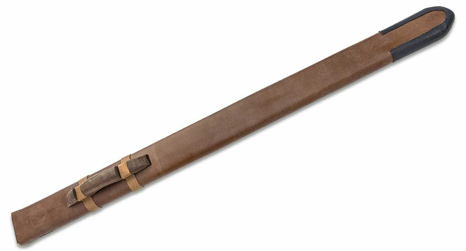 Wytrzymała skórzana pochwa ze wzmocnionymi zakończeniami chroni klingę i ułatwia przenoszenie oraz elegancką prezentację miecza we wnętrzu.