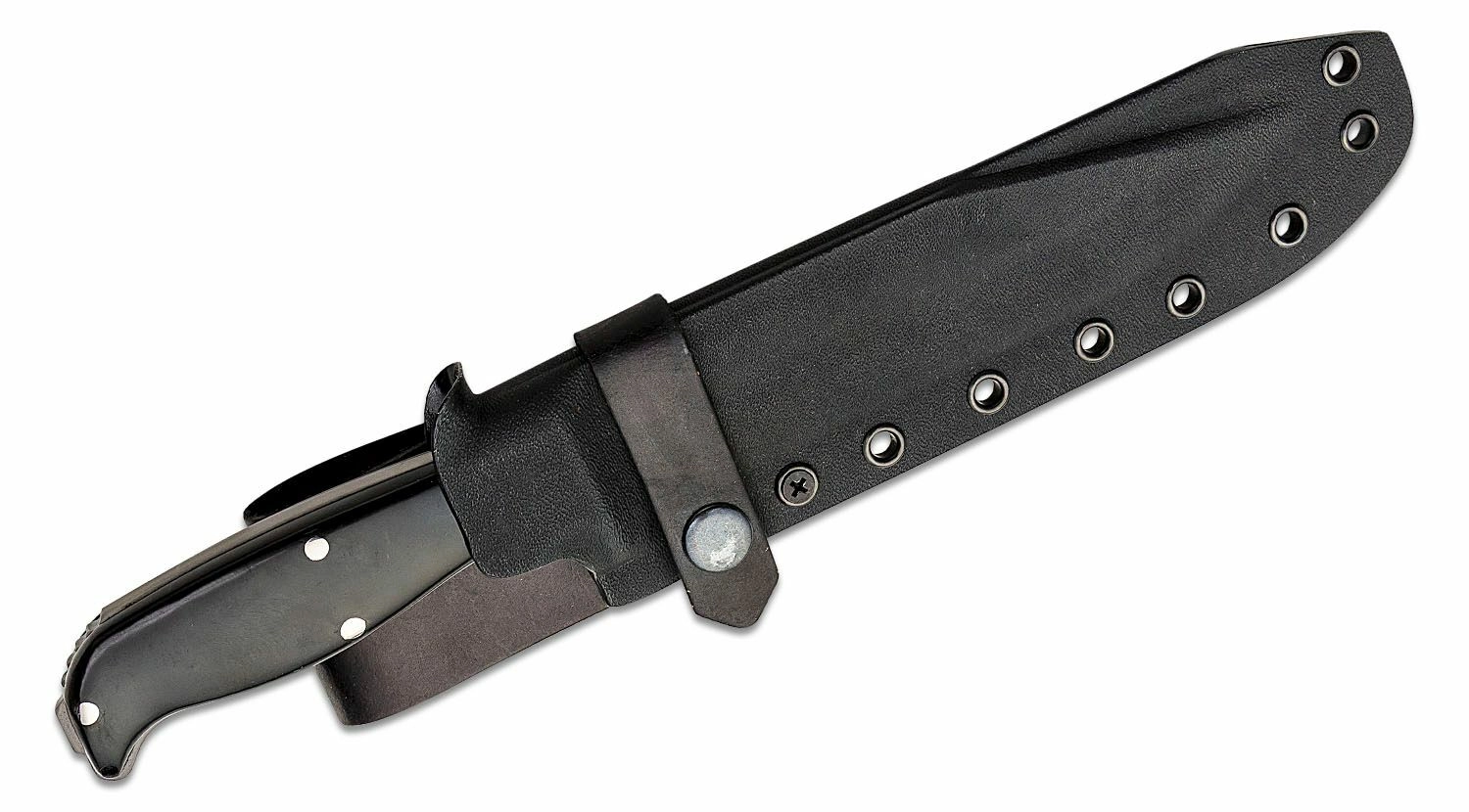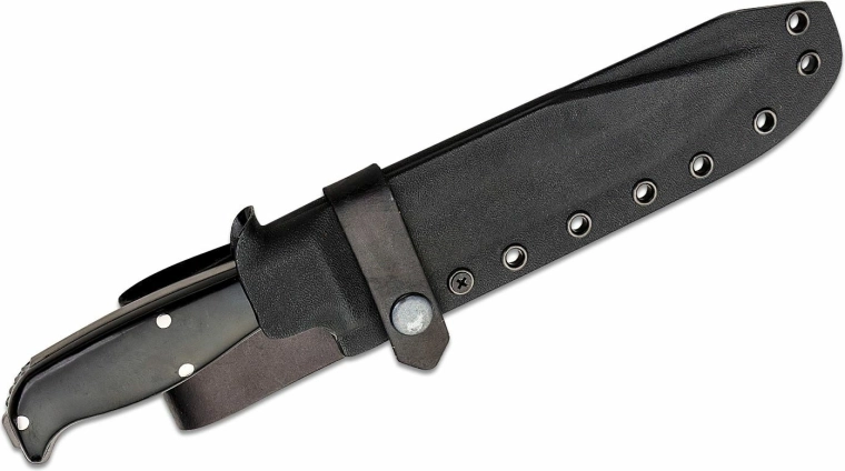 Czarna rękojeść z Micarty zapewnia bezpieczny i wygodny chwyt nawet na mokro lub w rękawicach. Zintegrowana bijakowa głowica na końcu rękojeści może służyć jako awaryjny młotek. Nóż dostarczany jest z solidną pochwą Kydex ze skórzaną pętlą, oferującą różne możliwości noszenia.