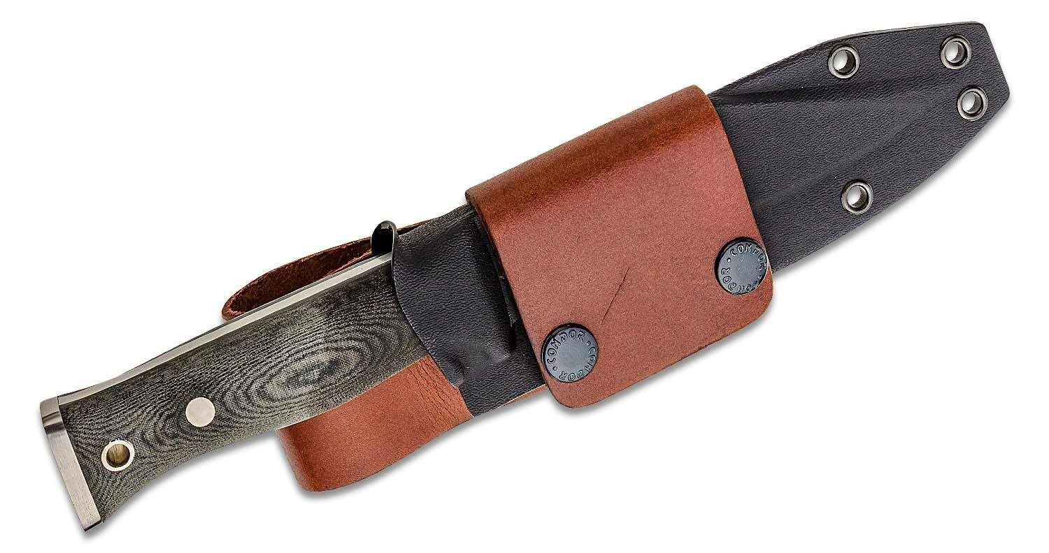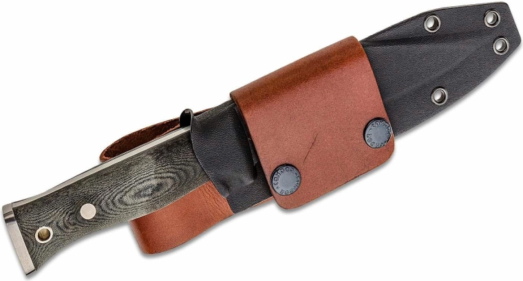 Ryflowany chwyt z Micarty w czarno-szarej kolorystyce pewnie leży w dłoni także w rękawicach, a na końcu oferuje bijak do uderzeń i wybijania szkła. Jednolita konstrukcja full-tang zwiększa odporność podczas batonowania i cięższych prac. Do noża dołączono kombinowaną pochwę Kydex + skóra dla bezpiecznego i wszechstronnego noszenia.