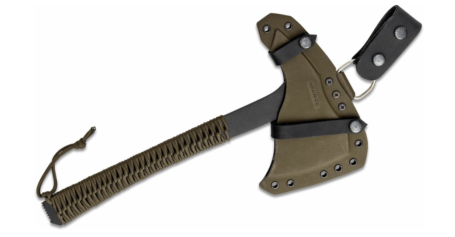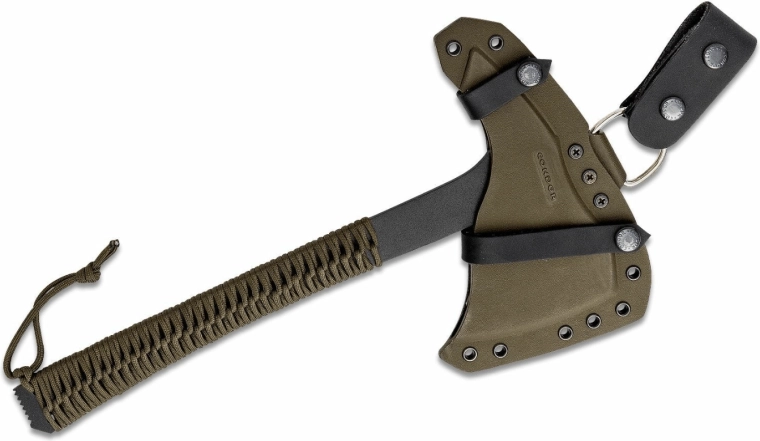 W zestawie znajduje się kabura kydexowa 710 Custom Sheaths, która umożliwia bezpieczne i elastyczne mocowanie do pasa, plecaka lub oporządzenia taktycznego. Dzięki wyważonej masie 817 g tomahawk jest dobrze kontrolowalny i nadaje się zarówno do pracy, jak i do treningowych rzutów.