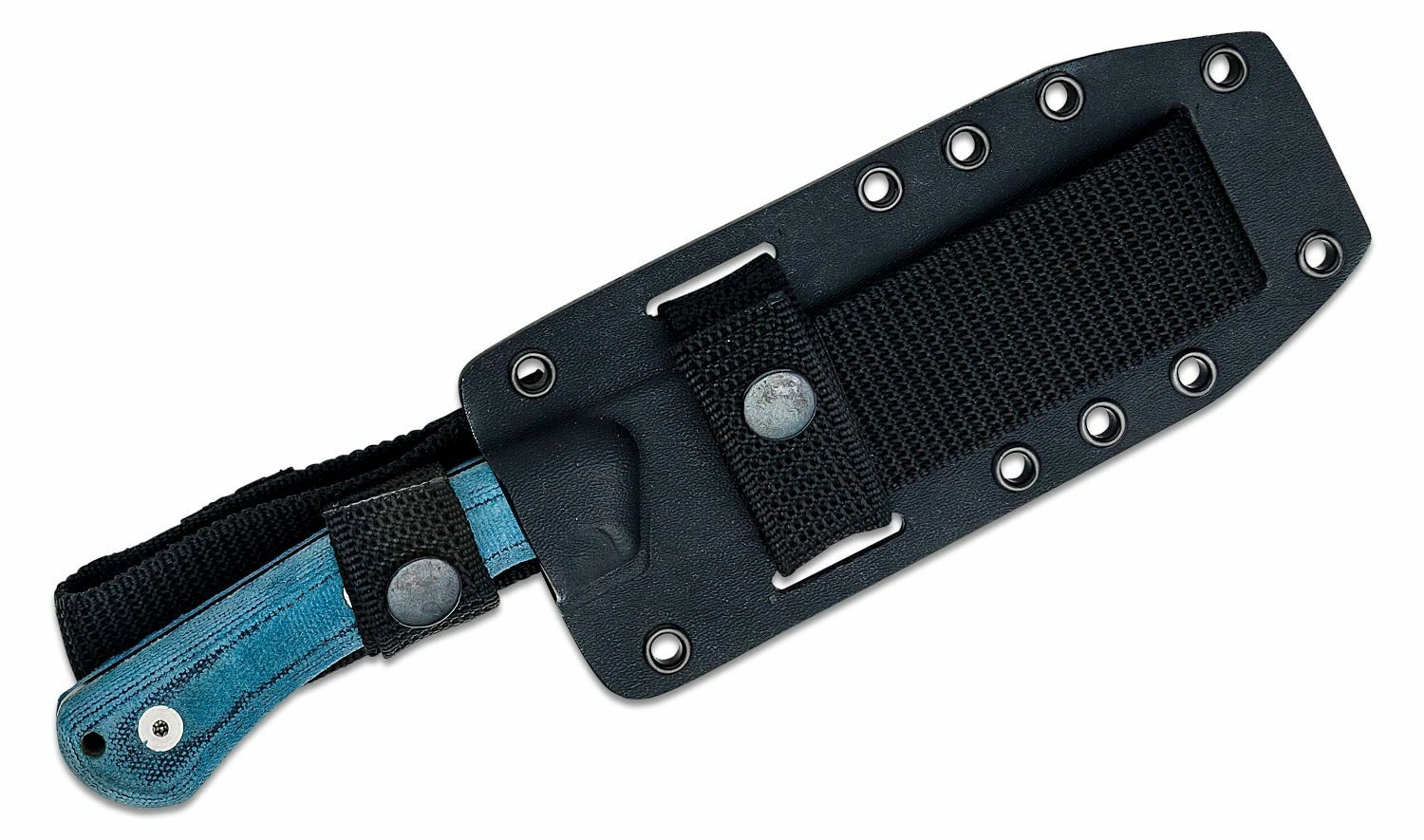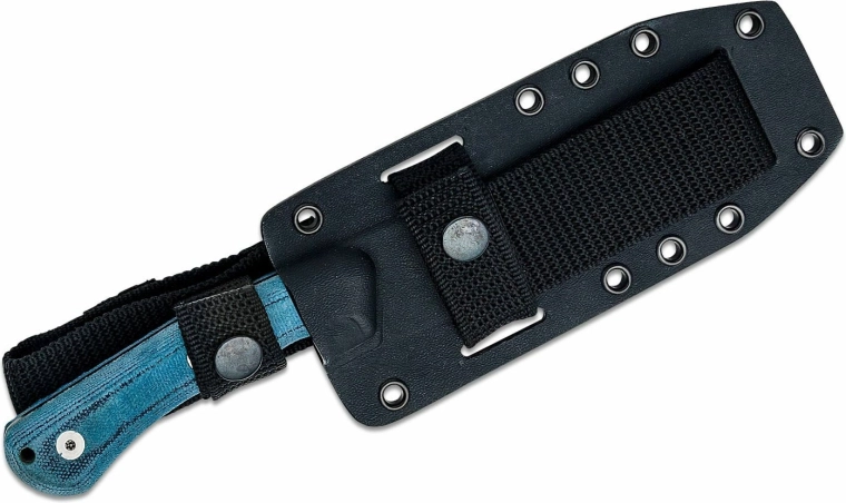 Rękojeść z niebieskiej Micarty o teksturowanej powierzchni zapewnia pewny i wygodny chwyt także na mokro. Oczko na linkę umożliwia dodatkowe zabezpieczenie. W zestawie znajduje się wytrzymała kabura Kydex kompatybilna z systemem MOLLE, co zapewnia elastyczne noszenie na oporządzeniu lub pasie.