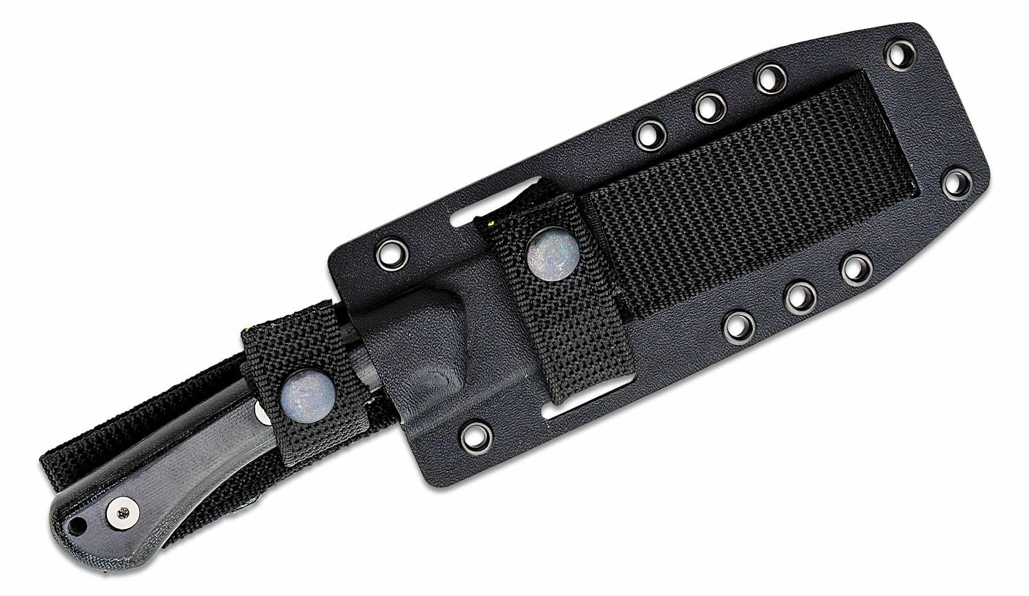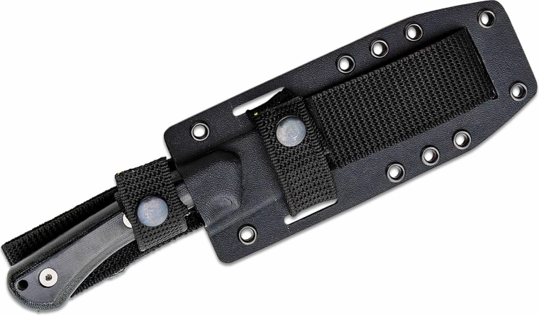 Ergonomicznie ukształtowana rękojeść z Micarty w kolorze czarnym zapewnia pewny chwyt nawet w wymagających warunkach. W tylnej części rękojeści znajduje się praktyczny otwór na linkę lub zawieszkę. W zestawie znajduje się solidna pochwa Kydex, kompatybilna z systemem MOLLE, umożliwiająca elastyczne noszenie na oporządzeniu.