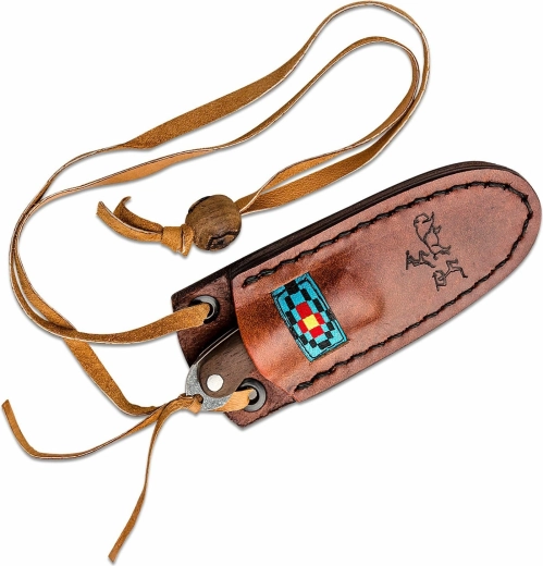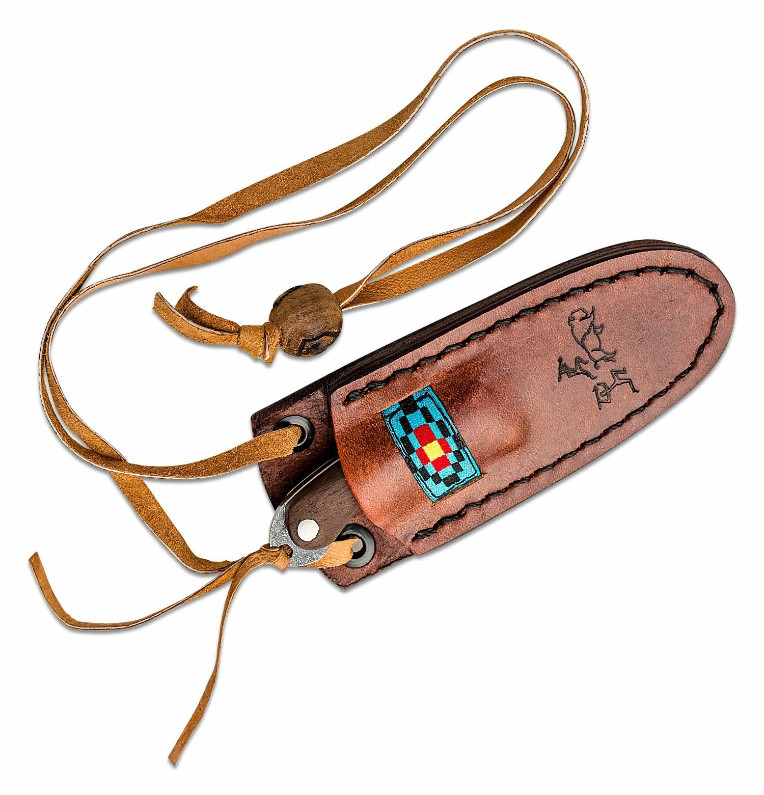 Rękojeść z drewna orzechowego uzupełniona turkusowym kamieniem zapewnia wygodny i pewny chwyt nawet w niesprzyjających warunkach. Nóż dostarczany jest ze skórzanym etui zdobionym motywem łowieckim oraz sznurkiem, które umożliwiają bezpieczne i stylowe noszenie na szyi.