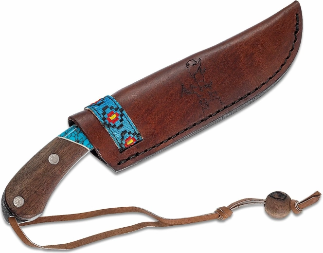 Rękojeść łączy drewno orzechowe i kamień turkusowy, zapewniając pewny i wygodny chwyt nawet w wymagających warunkach. Stylowe skórzane etui z zdobieniami umożliwia bezpieczne noszenie i szybki dostęp.