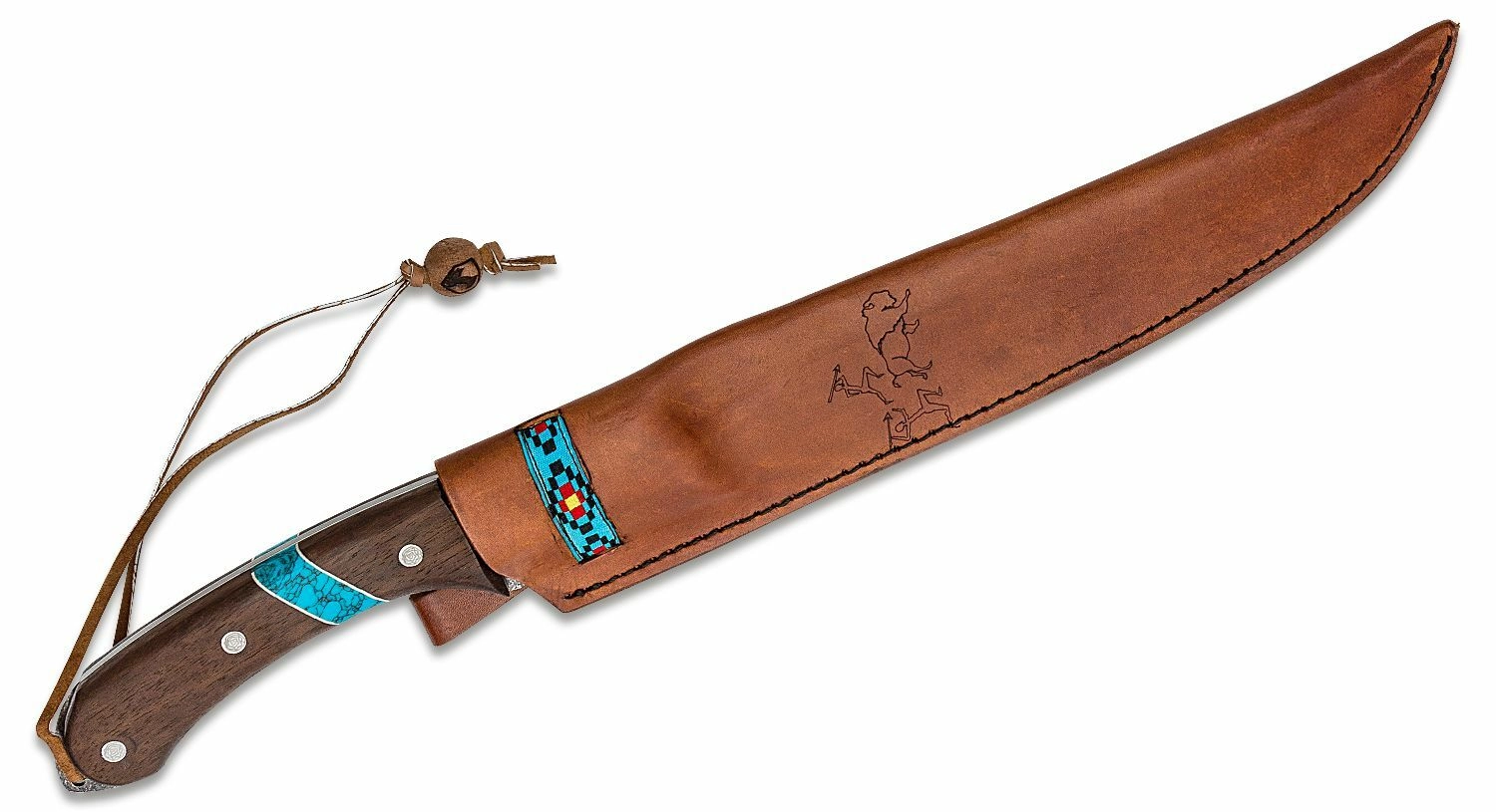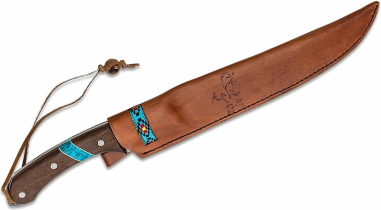 Rękojeść z wytrzymałego drewna orzechowego z turkusowym akcentem świetnie leży w dłoni i zapewnia pewny chwyt. Praktyczne oczko na linkę zwiększa bezpieczeństwo pracy. Skórzany pokrowiec z tradycyjnymi zdobieniami umożliwia wygodne i stylowe noszenie.