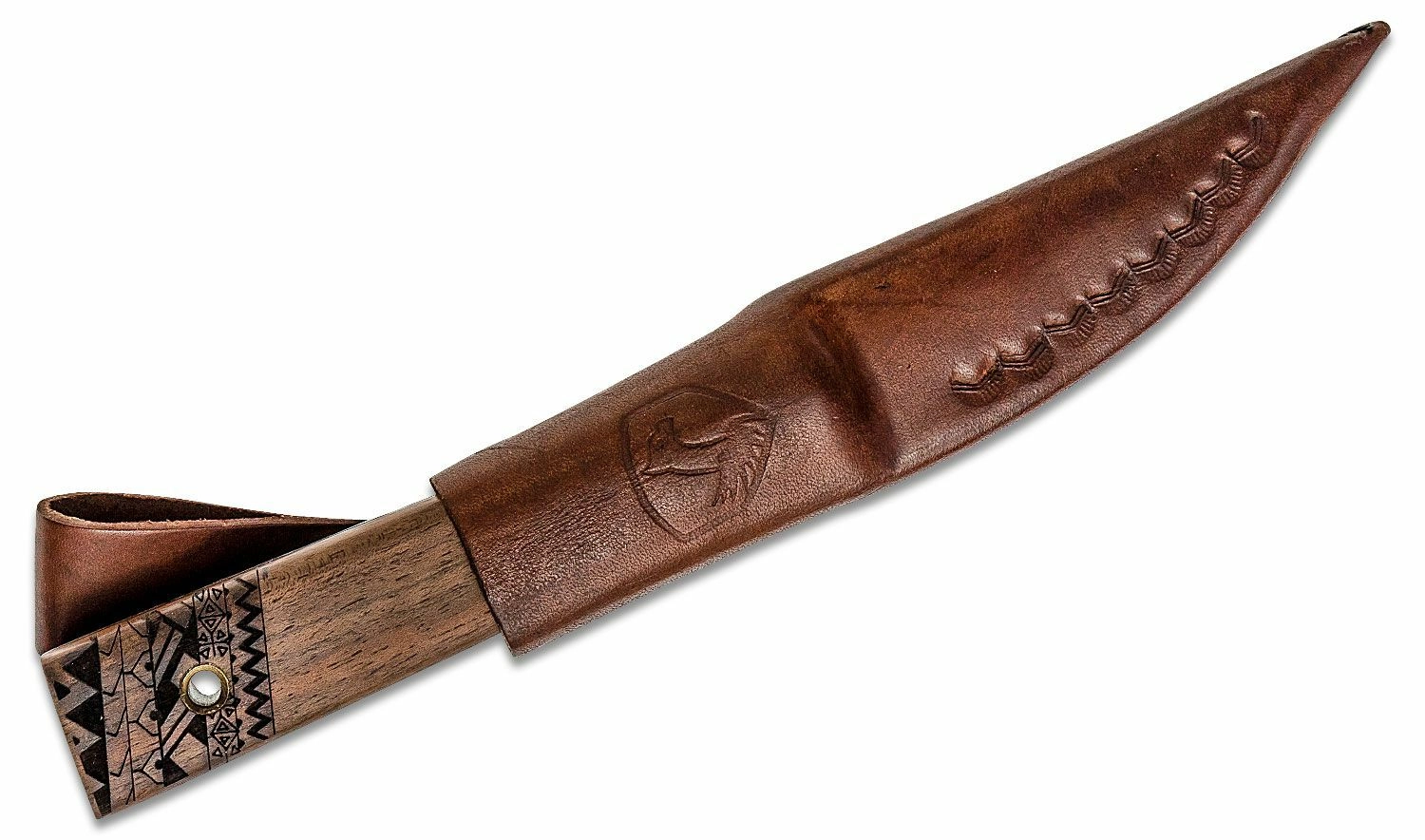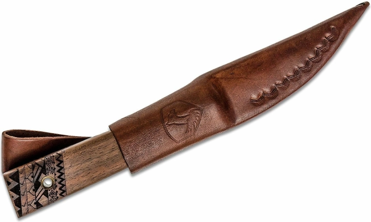 Rękojeść z drewna orzechowego świetnie leży w dłoni, a mosiężne owinięcie zapewnia nie tylko atrakcyjny wygląd, ale też pewniejszy chwyt. Zakończenie z rzeźbionymi detalami oraz otwór na linkę dodają funkcjonalności i estetyki. W zestawie znajduje się wysokiej jakości skórzane etui do bezpiecznego noszenia przy pasie.