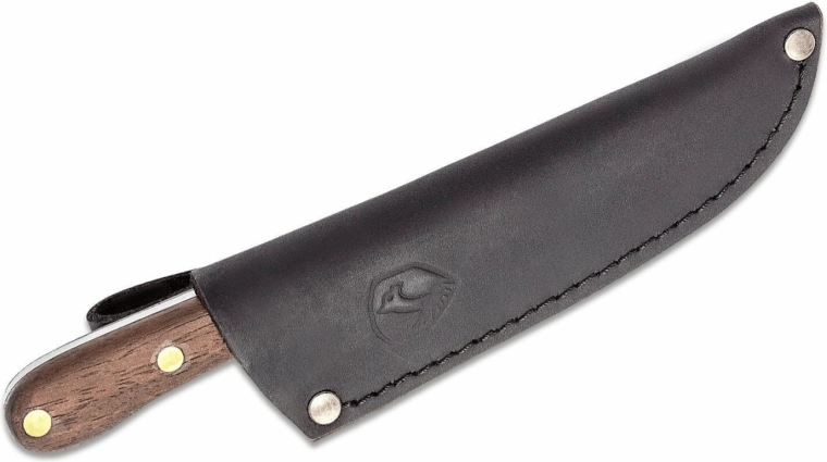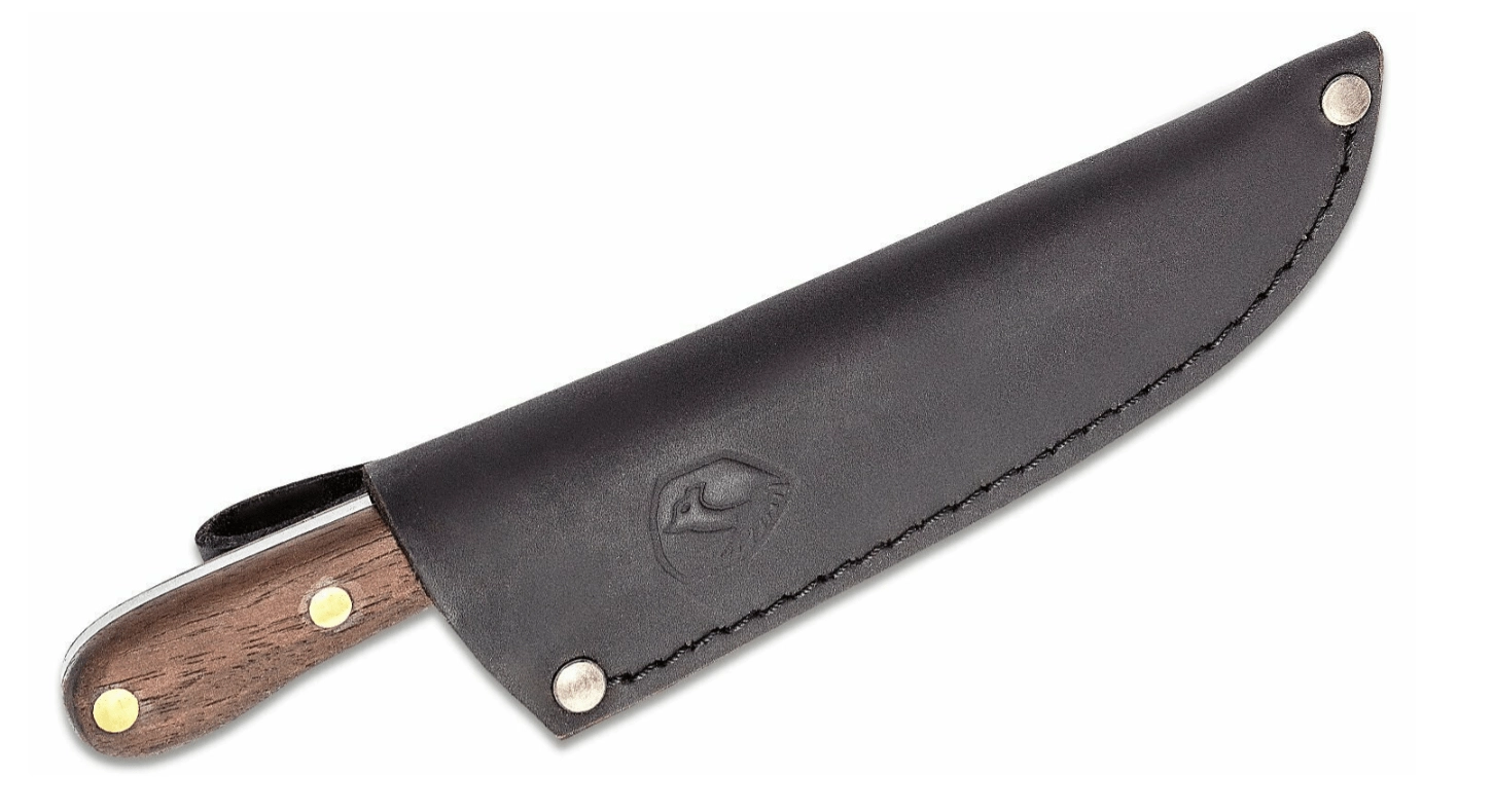 Elegancka rękojeść z orzecha pewnie leży w dłoni i zapewnia doskonałą kontrolę cięcia. W zestawie znajduje się skórzane etui do bezpiecznego i stylowego noszenia na pasku – idealny wybór dla każdego, kto chce praktyczny i wytrzymały nóż bez zbędnej masy.