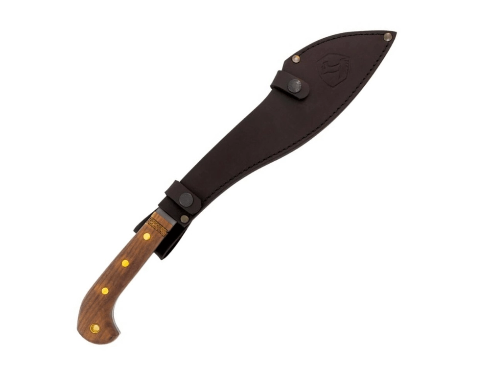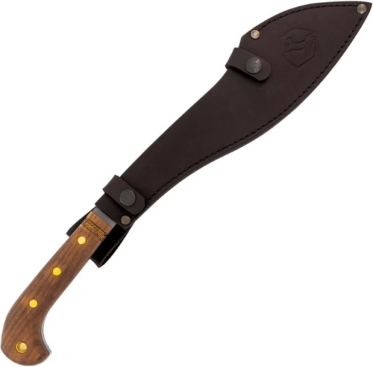 Ergonomiczna rękojeść z drewna orzechowego z poszerzonym zakończeniem gwarantuje pewny chwyt nawet przy energicznym rąbaniu. Maczeta jest dostarczana z wysokiej jakości skórzaną pochwą, która umożliwia bezpieczne przenoszenie i szybkie dobywanie w terenie.