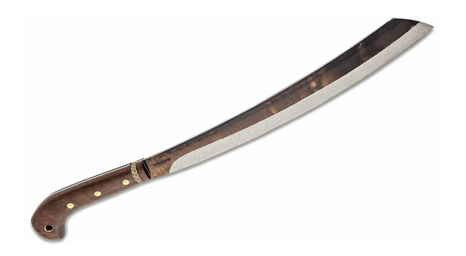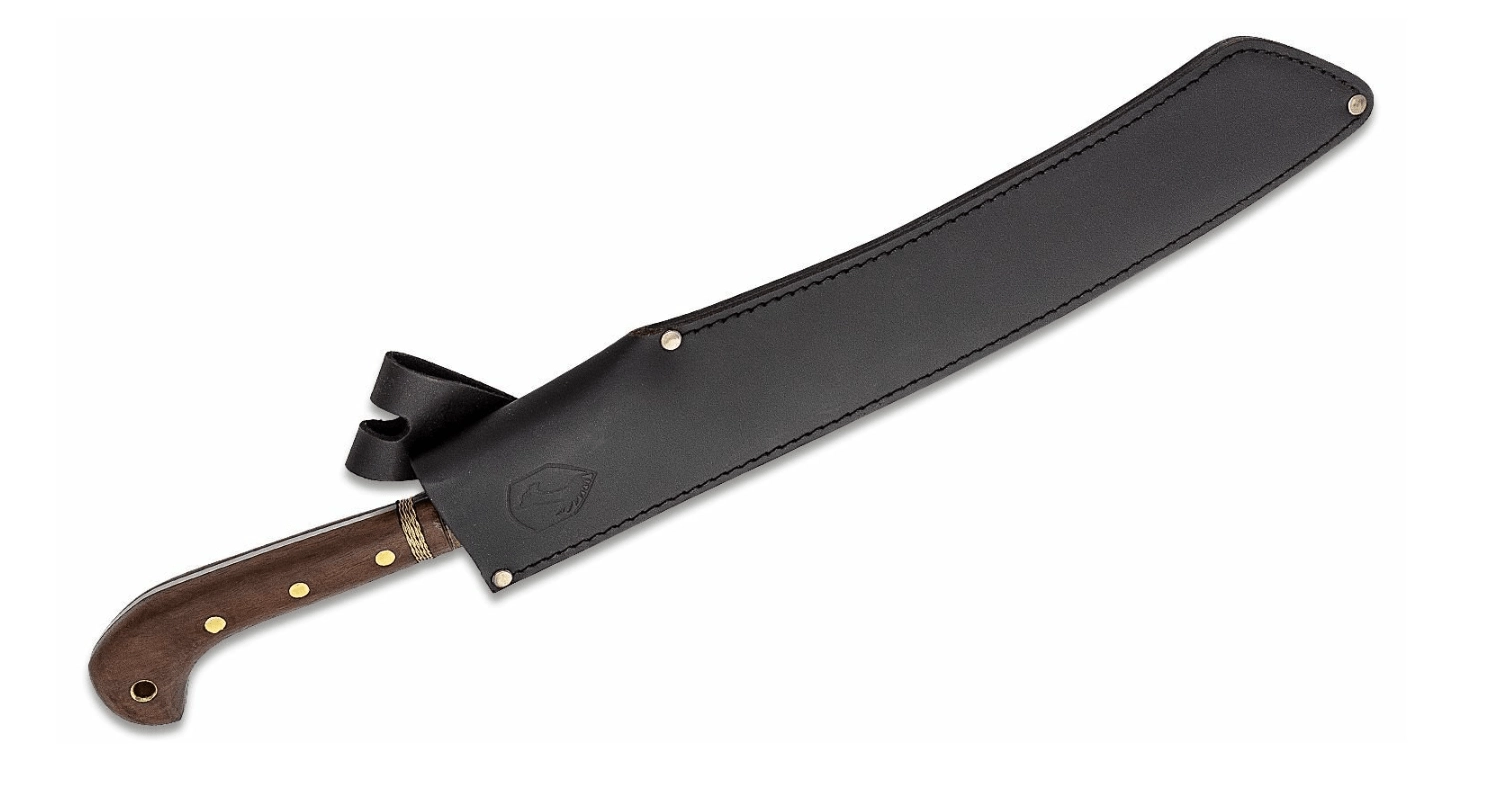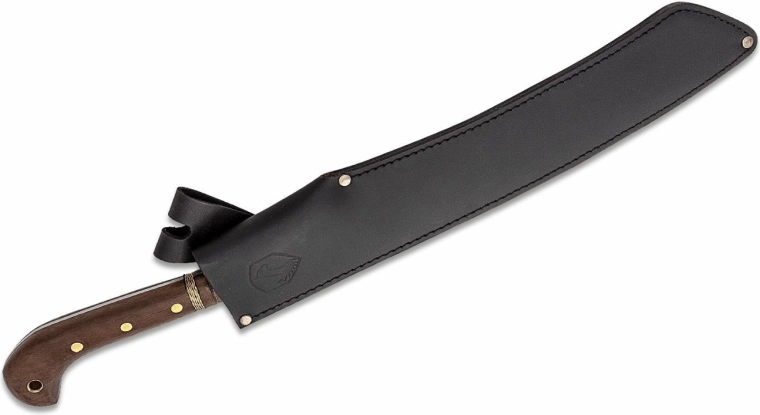 Ergonomiczna rękojeść z twardego drewna z dekoracyjnym mosiężnym oplotem świetnie leży w dłoni, a poszerzone zakończenie zapobiega ześlizgiwaniu się przy mocnych uderzeniach. Dla bezpiecznego przenoszenia w zestawie znajduje się wytrzymałe skórzane etui.