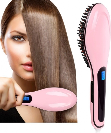 Ten produkt łączy funkcje prostownicy i szczotki w jednym, oferuje regulację temperatury w krokach co 5 °C od 80 °C do 230 °C i jest wyposażony w europejską wtyczkę.