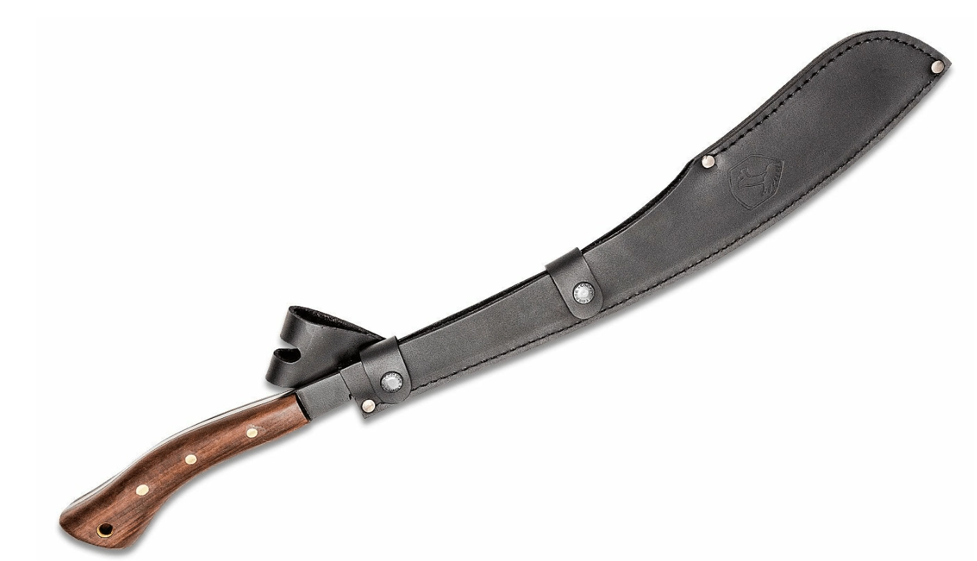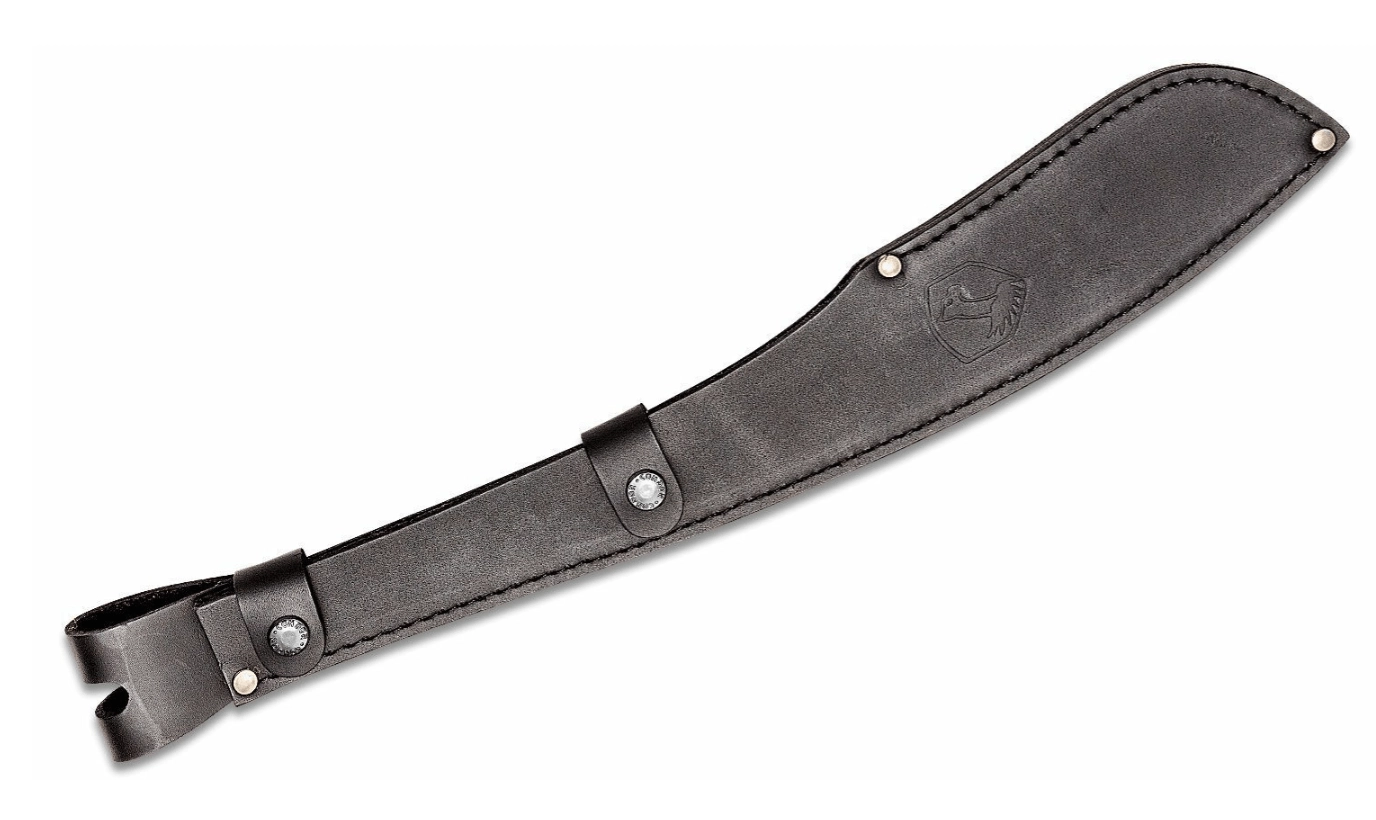 Trwały skórzany pokrowiec z pętlą na pasek chroni ostrze i użytkownika, a także pozwala mieć maczetę zawsze pod ręką.
